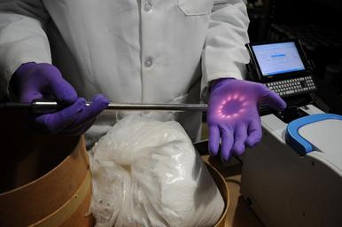 | Keywords: High-Tech Devices Help Ensure Product Safety.jpg FDA scientist prepares to test bags of lactose for the presence of melamine with the portable near infrared NIR spectroscopy device Lactose is a common raw ingredient in pharmaceutical http //therealproductreviews com products Portable rapid spectroscopic technologies ”which analyze the dispersion of an object ™s light to determine the object ™s chemical or molecular composition ”may hold the key to a new era of product-safety screening By allowing investigators to screen products earlier in the supply chain these portable devices could significantly cut risks from contamination or counterfeiting of medicines dietary supplements cosmetics and perhaps even foods For more information read this FDA http //www fda gov/ForConsumers/ConsumerUpdates/ucm274100 htm Consumer Update 2010-09-10 13 55 33 https //www flickr com/photos/fdaphotos/6198562582/ The U S Food and Drug Administration other versions PD-USGov Near-infrared spectroscopy Food and Drug Administration United States |