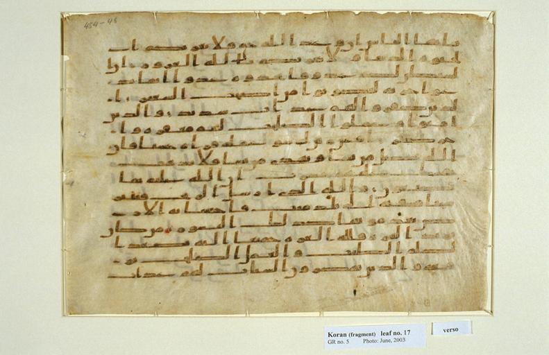 | Keywords: Hijazi script 2 - Qur'anic verses.jpg en Verses 53-54 of the 34th chapter of the Qur'an entitled Surat Saba' Sheba as well as the first ten verses of the 35th chapter of the Qur'an entitled Surat al-Fatir The Originator The text is executed in Hijazi 1 script in black ink at fifteen lines per page This kind of script is typical of Qur'ans in the horizontal format produced during the 8th century page 2 of LOC-calligraphy ascs 295 Unknown Calligrapher century 8 PD-Art Hijazi style Qur'an manuscripts 8th century Library of Congress Arabic Persian and Ottoman calligraphy collection |