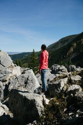 Keywords: hiking hiker girl woman jeans sweater hoodie rocks mountains trees hills outdoors blue sky people
