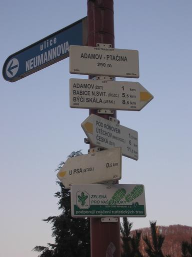 Keywords: Hiking in Adamov.jpg Hiking in Adamov own 2006-01-23 Lukáš Malý uvolňuji dílo Hiking and footpath fingerposts in Blansko District Street signs in the Czech Republic Adamov Altitude signs of KČT marking