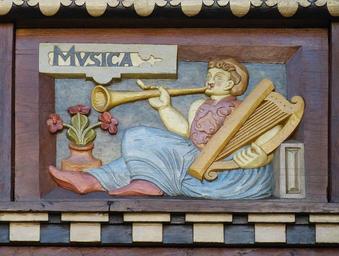 Keywords: hildesheim germany lower saxony historically old town facade truss fachwerkhaus relief image woman music harp instrument trumpet