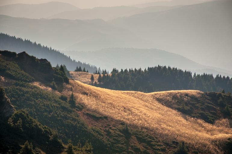 Keywords: hill mountain slope side sun light patch meadow forest trees vegetation nature range view mist