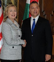 | Keywords: HillaryClintonHungary3.png en U S Secretary of State Hillary Rodham Clinton and Hungarian Prime Minister Viktor Orban shake hands before the inauguration of the Tom Lantos Institute in the Hungarian Parliament building in Budapest Hungary June 30 2011 2012-01-08 http //www flickr com/photos/statephotos/5887759291/in/photostream/ flickr com United States Government Techman224 2012-01-08 PD-USGov Uploaded with UploadWizard Hillary Rodham Clinton in 2011 Viktor Orbán in 2011 Handshakes involving politicians Photographs of flags of the United States Photographs of flags of Hungary |