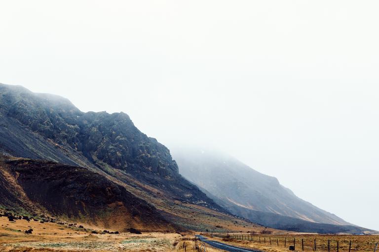 Keywords: hillside road street valley steep slope mountain landscape foggy misty nature outdoor rural travel countryside track dirt road