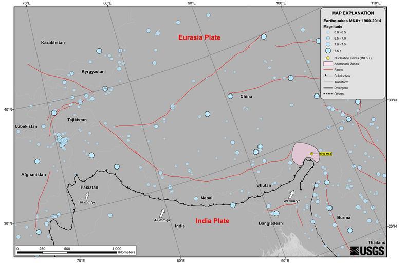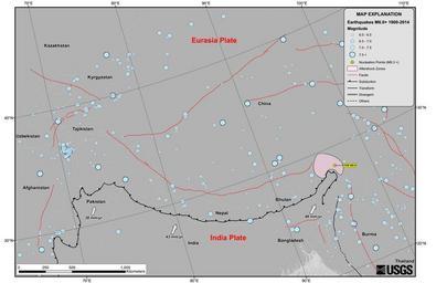 | Keywords: Himalayan Tectonic Summary.png en Seismicity in the Himalaya dominantly results from the continental collision of the India and Eurasia plates which are converging at a relative rate of 40-50 mm/yr Northward underthrusting of India beneath Eurasia generates numerous earthquakes and consequently makes this area one of the most seismically hazardous regions on Earth The surface expression of the plate boundary is marked by the foothills of the north-south trending Sulaiman Range in the west the Indo-Burmese Arc in the east and the east-west trending Himalaya Front in the north of India 2015-04-26 http //earthquake usgs gov/earthquakes/tectonic/images/himalaya_tsum pdf United States Geological Survey other versions PD-USGov Uploaded with UploadWizard Maps of 2015 Nepal earthquake |