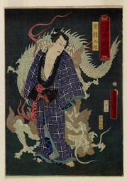 | Keywords: Hiranoya Shinzo - Toyokuni kigo kijutsu kurabe - Walters 95131.jpg The actor Kawarazaki Gonjūrō I in the role of Unryū Kurō The monk Kurodo Tokugo wanted to get back at the people who ridiculed him because of his big nose but his scheme failed He posted a notice saying a dragon would rise out of Sarusawa pond on a certain day When he went to the pond he meant to ridicule everyone who would believe something so absurd But instead he got caught up in the excitement of those who were awaiting the dragon and forgetting his own made-up story he joined in the chanting of Buddhist prayers Although--according to the story--no dragon ever appeared in this print a grinning dragon spirit materializes behind the monk as he frantically makes magic gestures 1862-11 late Edo pigments mulberry paper cm 35 25 5 accession number 95 131 24746 Justine Lewis Keidel date and mode of acquisition unknown Walters Art Museum Gift of Justine Lewis Keidel 1986 Signature Ki-ō Toyokuni hitsu; Translation By the brush of the old man Toyokuni place of origin Japan 006-3828 Walters Art Museum license 2D Japanese prints in the Walters Art Museum Historic samurai prints Media contributed by the Walters Art Museum needs category review Utagawa Kunisada |