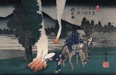Keywords: Hiroshige Travellers lighting their pipes by a fire.jpg Artwork Creator Hiroshige Utagawa From Hiroshige's series Sixty-nine Stations of the Kisokaido 1834-1842 view 19 and station 18 at Karuisawa ~ 1835 1837 Source http //visipix com/ woodblock color print object history exhibition history credit line accession number place of creation 150px 150px PD-old-100 The Sixty-nine Stations of the Kiso-kaidÅ Kisokaido18 Karuizawa Nagano People with kiseru in art |