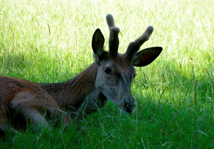Keywords: hirsch red deer wild forest forest animal nature animal animal world paarhufer meadow grass green peaceful wild animal in the free fawn happy attention lying