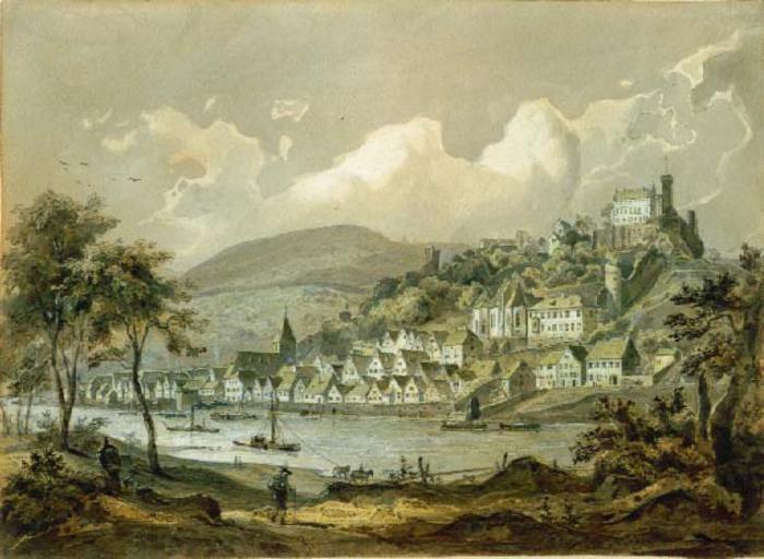 Keywords: Hirschhorn hoefle.jpg ~ 1848 Pinsel-und Federzeichnung mit Lavis und Gouache source Other versions PD-Art Burg Hirschhorn Neckar in Hirschhorn Neckar Neckar in art
