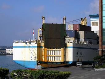 Keywords: Hiryu21 at Keelung.jpg en Cargo and passenger Cruise Ferry Hiryu 21 of the Arimura Line out of Naha Japan docked near the Port Authority in Keelung Harbor Taiwan IMO Number 9135250 Callsign 7MGD Length 167 m Beam 22 m own 2007-01-01 Changlc Cruise Ferry Hiryu 21 ship 1996 Sterns Stern ramps Ships in Keelung January 2007 in Taiwan |