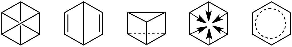 Keywords: Historic Benzene Formulae V.1.svg en Historic_Benzene_Formulae Benzene de Historische_Benzol_Formeln Historische_Benzol Strukturformeln Benzol own Jü 2010-07-18 Claus Dewar Ladenburg Armstrong Thiele Benzene Dewar benzene