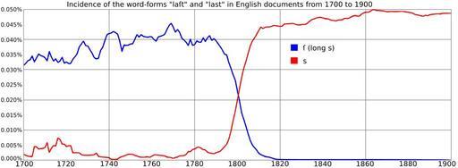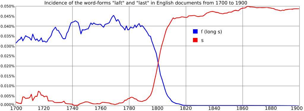 Keywords: Historical usage of long s.svg en Historical usage of long s See below Dave Farrance 2010-12-18 Source The source data was Google's http //googleresearch blogspot com/2006/08/all-our-n-gram-are-belong-to-you html web n-grams database which is released by Google under the Creative Commons http //creativecommons org/licenses/by/3 0/deed en Attribution 3 0 Unported licence I created the two graphical curves with Google's http //ngrams googlelabs com/ ngram viewer which generates a bitmap output With Inkscape I extracted the two curves from the bitmap and converted them to vector-objects then I manually re-drew the grid and legends I set the ngram viewer to show the incidence of the words laſt and last in all English documents including British and American from 1700 to 1900 I actually entered the words laft with a small-F and last because Google's OCR technology misread the long-s as an f This situation may be corrected by Google later but it currently December 2010 gives a method of distinguishing between the two forms of s The ngram viewer allows the user to examine a sample of documents that were referenced by the search with the target words highlighted I saw that the apparent minor peaks of short-s usage during 1700-1800 were largely not due to actual short-s usage but due to the occasional use of a different OCR technology that was able to recognize the long-s as an s rather than an f This was particularly noticeable when the ngram viewer was set to look at American documents only which gave unusably uneven curves from 1700-1800 partly because there are not enough American documents from that period to form smooth curves and because of the usage of the better OCR on about one-third of the American documents from that period Data from Google used to create this diagram cc-by-3 0 With the proviso that the source data was licensed as Creative-Commons I release the diagram itself as PD Long s |