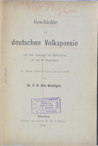 | Keywords: History of german folklore poetry 1294.jpg Friedrich Heinrich Otto Weddigen Iсто ія німецької на одної поезії з се едньовіччя й донині юнхен 1884 Титульний а куш З особистої бібліотеки І Ф анка Geschichte der deutschen Volkspoesie München 1884 1884 Institution Shevchenko Institute of Literature Digital Collection PD-old-70-1923 1790 books from Germany Franko Personal Library Collections of books in libraries in Ukraine Shevchenko Institute of Literature Uploaded with VicuñaUploader | ||||