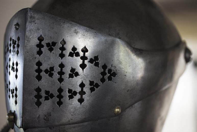 Keywords: Hjälmvisir, 1500-talets slut - Skoklosters slott - 100603.tif LSH artwork sv Helrustning ej komplett Alla delar stämplade med Augustburgs pinjekotet och sax Enligt 1930 års katalogkort även med initialerna C S har ej kunnat upptäckas nu 1500-talets slut <br/>Bestående av 19760819 <br/>Bröstharnesk 14855 1<br/>Ryggharnesk 14855 2<br/>Ringkrage 14855 3<br/>ländskört 14855 4<br/>h axelstycke med armskydd 14855 5<br/>h handske 14855 6<br/>v axelstycke med armskydd 14855 7<br/>h lårskena med knäbuckla 14855 8<br/>v lårskena med knäbuckla 14855 9<br/>hjälm 14855 10<br/>v handske 14855 11<br/>14855 1 Bröstharnesk Låg rundad snedräfflad halshanr Dubbla graverade linjer kring hals armar och nedre kant Svagt markerad mittås Två mässingsnitar i nederkanten - för att fösta tassetterna vilka nu saknas Har troligen haft dekor av mässingsnitar utmed nederkanten Spår finnes Fastnitade läderremmar vid axlarna - att spännas vid ryggstycket <br/>H 380 mm bröstvidd 500 mm <br/>14855 2 Ryggharnesk Låg rundad snedräfflad halskant Graverade linjer på motsvarande sätt som bröstharneskets axelstycken I midjans högra sida fastnitad vit sämskad rem - spår av läderrem i vänster sida finnes <br/>H 365 mm ryggvidd 530 mm <br/>14855 3 Ringkrage med halskrage bestående av tre lameller upptill avslutad med snedräfflad kant Mässingsnitar Fodrad med vitt matlareat tyg kantat med röd sammet <br/>14855 4 Ländskört Bestående av fem lameller med mässingsnitar Påhakat vid ryggharnesket på högra sidan spärrat med hake <br/>H 180 mm b 870 mm <br/>Tillbehör Stativ nr 14866<br/>14855 5-7 11 Axelstycken med armskydd och till hörande handskar Axelstycket består av fem lameller - ryggbladen stora De sidor som går in över överarmsskyddet har tandad kant Främre nedre lamellen med mässingsros saknas på 14855 7 Axelskydd med mässingsfodrat spänne i vilket rem från ringkragen spännes Armbucklan med snidad lotusblomma Handske nr 14855 6 är komplett med stelt handledsskydd och hand-och fingerskydd T o m främre knogen bestående av lameller 14855 11 saknar de sex främre lamellerna med knogskydd 14855 11 har röd sammetskantad överkant - saknas på 14855 6 <br/>L armskydd 770 mm diam 470 mm l handske 67 mm fel mått diam 97 fel mått mm<br/>14855 8-9 Lårskenor med knäbucklor Lårskenan i två delar Den övre bestående av 4 lameller - den undre av en hel skena med knäbuckla av 8 lameller nr 14855 8 saknar nedersta delen Skarven mellan de båda delarna ornerade med räffelgraverad rund kant Dekor av graverade linjer och mässingsnitar <br/>L 520 mm b 360 mm <br/>14855 10 Hjälm visir hjälm låg mjuk rundad kant Utan hjälmkrage nertill avslutad med liten kant räffelgraverad Högra sidan med stödstång för visiret Invändigt korsade hjässremmar av sämskat skinn <br/>H 300 mm original caption Hjälmvisir 1500-talets slut <br/> Nyckelord Rustningshjälm Föremålsbild 1500-tal Visir end other date century 16 size mm 1040 SKO C S place of origin original filename sm_dig15697 35687 inventory number SKO 14855 100603 CC-BY-SA Miguel Herranz <gallery caption Different images of same object > File Rustning 1500-talets slut - Skoklosters slott - 100602 tif File Rustningshandske 1500-talets slut - Skoklosters slott - 100608 tif File Armskydd till rustning 1500-talets slut - Skoklosters slott - 100607 tif File Rustning och nitar 1500-talets slut - Skoklosters slott - 100605 tif File Rustning och nitar 1500-talets slut - Skoklosters slott - 100609 tif File Hjälmvisir 1500-talets slut - Skoklosters slott - 100604 tif File Rustning och nitar 1500-talets slut - Skoklosters slott - 100606 tif </gallery> Close helmets 16th century Military helmets Miguel Herranz Media contributed by LSH 2015-11 Arms and armour in the Skokloster Castle |