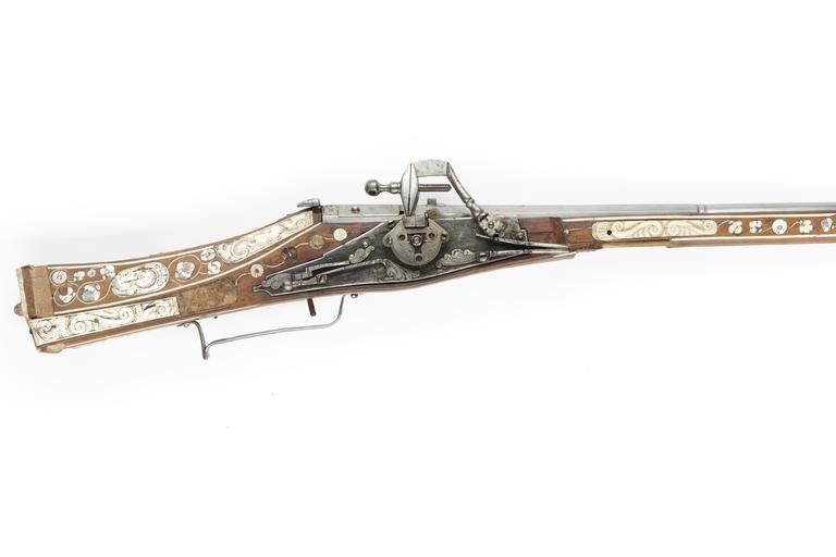 Keywords: Hjullåsbössa, 1580 - Skoklosters slott - 90842.tif LSH artwork sv Rund över kammaren åttkantig slätborrad pipa Bakladdningsmekanism Vid tryck på knapp i form av manshuvud invid svansskruvbladet uppspringer kammarens lockförsedda bakre del så att patron kan införas På svansskruvbladet stämpel med genomborrat hjärta Stöckel nr 5135 Augsburg ca 1580 Sikte av stål knoppkorn av mässing Tre piphäften <br/>Hjullås Blånerat låsbleck av äldre tysk typ Låsdelarna ej blånerade Hjulet täckt av genombruten platta med något graverad dekor Mycket låg krutskärm Hane med lös underkäke Käkskruv i form av tjock ring Låsbleckets bakre del med virvelsäkring <br/>Hel stock av ljust trä Äldre tysk kolvtyp Bakplåt och stödkula av vitt ben Senare inristat årtal 1636 Bakplåt och stödkula av vitt ben Senare inristat årtal 1636 Hela stocken inlagd med plattor rankor och blommor av ben med graverad dekor Näsband och rörka av ben Rak varbygel av stål påminnande om en holsteinsk varbygel <br/>Tillbehör Laddstock av trä saknar doppsko <br/>Märkt 112 ovanför låsblecket stanstyp 5373 Rött lacksigill fragmentarisk och nernött ovanför kolvlådan original caption Hjullåsbössa 1580 <br/> Nyckelord Föremålsbild Dekorerade Intarsia Hjullåsbössa 1580 cirka 1636 bone - wood - steel size mm 1235 size mm 940 pipa size mm 135 SKO place of origin original filename sm_dig7521 33736 inventory number SKO 12698 90842 CC-BY-SA Erik Lernestål Decoration Inlay art Wheellock firearms Muskets Photographs of weapons by Erik Lernestål Media contributed by LSH dim-with multiple size templates Media contributed by LSH malformated year Media contributed by LSH 2016-05 |