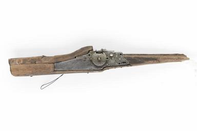 Keywords: Hjullåsbössa, 1600-tal - Skoklosters slott - 90990.tif LSH artwork sv Hjullåsbössa söndrig Tysk eller dansk tillverkning 1600-talets början <br/>Pipa saknas Har varit slåtborrad <br/>Hjullås Låsbleck av tysk typ Bakåt avsmalnande genom två fall Mycket låg krutskärm Hjulet med graverad dekor numera mycket nött <br/>Hel stock av trä Tysk kolvtyp Mycket smal vinge Ursprungligen två låsskruvsbrickor av ben Kolvlåda med lock Framstocken avbruten - finnes Sluten laddstocksränna Benbrickor kring pipstiftshålen <br/>Tillbehör Laddstock <br/>Märkt 10 5 inslaget ovanför låsblecket stanstyp 5373 <br/>Rött lacksigill ovanför kolvlådan <br/>1710 års inventarium rum II p 10 137-105-1 Gammal gemen Hagelbyssa med Hiulååss original caption Hjullåsbössa 1600-tal early other date century 17 wood - steel SKO place of origin original filename sm_dig7666 35829 inventory number SKO 14971 90990 CC-BY-SA Erik Lernestål Muskets Photographs of weapons by Erik Lernestål Media contributed by LSH 2016-05 |