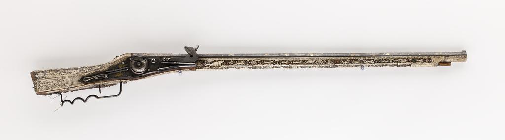 Keywords: Hjullåsbössa - Livrustkammaren - 95347.tif LSH artwork Barthel Beham konstnär Virgils Solis konstnär grafiker sv Rund slätborrad blånerad pipa med trumf och åttsidig kammare Rektangulärt böjt svansskruvblad Pipans ovansida täckt av nästan yttäckande påslagen dekor av guld och silver rankverk samt på pipans runda del två ovala kartuscher På kammarenssidofaser vid pipbasen stämplar i form av musselskal LRK vägl 1921 195 Därframför en stående naken kvinna med guldslöja över skötet i h hand ett timglas Tiden därovanför textband BEDENCK D S END På kammarens sidor i rankverket infogade framåt springande hundar rävar och harar av guld och silver Baktill på pipans runda del i den bakre kartuschen en stående kvinna med naken överkropp hellång guldkjol i h hand en guldvåg i v ett svärd med guldfäste Mittpå den runda delen i den främre kartuschen en stående kvinna huvudet profil h lång klänning av guld i h hand ett palmblad av guld i den v en otydlig figur stadsmodell 55 mm från mynningen en graverad björn på ryggen uppåtriktade svinbortsliknande hår sittande och spelande på en säckpipa av guld <br/>Riktmedel Mellan kartuscherna björnen och kornet påslaget en silversiktlist Inlaxade riktmedel siktet saknas korn av silver <br/>Fästning Tre häften Pipan fäst med krysskruv underifrån varbygelskruven samt tre nya pipstift av trä <br/>Hjullås med plant blånerat bakåt i avsatser avsmalnande låsbleck av stål litet rundat ändutskott Hjul fäst med inåtlutande ring samt välvd hjulkapsel Fängpanna utan krutskärm lock med rörlig rektangulär arm Tryckknapp med svagt välvt huvud med skruvskåra Lång hane med kropp med fyrsidigt tvärsnitt innerkanten fasad nästan ringformig hanhals Överkäken lös kort svagt uppåtsvängt fingergrepp med ändvulst Hanskruv med fyrsidigt huvud Kraftig hanfjäder främre delen med rundade kanter bakre hälften med rankdekor ingen studel långt spetsigt åsat löv På låsblecket hjulkapseln och fängpannegaveln påslagen dekor av guld och silver rankverk och bakom hjulet två guldfåglar och en av silver framför hjulet ett bakåtseende rovdjur med kort svans och prickig päls leopard Nedanför säkringsfjädern samma stämpel som på pipan På fängpannelocket en graverad lejonmaskaron på armen ett serafhuvud med vingarna riktade bakåt På hanen graverad bladdekor på ringen på spetsen en maskaron <br/>Säkring Bakom hjulet virvelsäkring med ringformigt fingergrepp fjäder med streckdekor studel med droppformigt svagt välvt löv med mittstreck <br/>Fästning Två låsskruvar <br/>Avtryckare Rak avtryckare med liten ändkula i avtryckarblecket en ställskruv infälld i kolven <br/>Helstock av valnöt med liten vinge kolvlåda och sluten laddstocksränna Nästan yttäckande dekor av vita och grönfärgade beninläggningar hjorthorn Bakplåten samt kantlisterna runt kolvänden saknas nästan helt Utefter stockens kanter lister med beslagsornamentik och flätmönster bakre delen av listen till h om kolvryggen ersatt Vid svansskruvbladets sidor två benplattor med nakna musicerande pojkar till v en lutspelare till h en med fiddla På kolvryggen bakom svansskruvbladet en platta med en mansbyst skäggigt ansikte därbakom ett rankverk och tre papegojor vindruvsklasar fruktfat samt en karyatid På kolvens h sida ovanför kolvlådelocket en figurscen med nakna människor Helenas bortrövande från h ryttare med spjut ersatt båt och två män som hjälper Helena stiga upp i båten stridsscen med 8 stående och en liggande man med klubbor och sköldar till h därom två bågskyttar en ryttare och ytterligare två bågskyttar Kolvlådelock med plan platta av hjorthorn därpå en stående kvinna huvudet profil v klänning och mantel i h hand ett brinnande hjärta i v en pil upptill text VENVS träplattan och fjädern utbytta Framför locket likaså en utbytt benplatta med bladdekor På anslaget en figurscen med Pauli omvändelse till v två ryttare med stegrande hästar en häst utan ryttare Paulus halvliggande på marken och ovanför honom ett moln och Guds bild längst till h ryttare Paulus och ryttarna i antikiserande rustningar Mellan låsskruvarna jaktscen med ryttare med spjut till v hjort som tvingats på knä av två hundar På framstockens sidor jakt- och djurbilder <br/>På v sida bakifrån ryttare med tvåklogaffel och vildsvin som står över en fallen jägare två hundar; jägare vänd mot kolvänden och björn angripen av två hundar; jägare som blåser i horn På den smalare delen därframför hjort och två hundar hund hjort två hundar hornblåsare hund hund och hornblåsare tre hundar två harar samt tre hundar och liggande byte <br/>På framstockens h sida bakifrån björn omgiven av två hundar och två jägare med björnspjut den främre jägaren mindre och placerad på framstockens smalare del; därframför hjort och bakåtvänd jägare med spjut; tre hundar; vildsvin och två bakåtvända jägare den bakre till häst; bakåtvänd hund och framåtvänd hornblåsande jägare; fyra hundar och därframför liggande byte omgivet av två hundar springande hare samt en liten mansfigur <br/>Näsband l 57 mm med bladdekor På h sida saknas de två bakre pipstiftbrickorna den främre ersatt med en nytillverkad kopia av den på v sida Överrörka och spetsrörka i form av benplattor med graverad dekor <br/>På stockens undersida bildfält med de nio muserna på framstocken och sju planeter på kolven På överrörkan en kvinna profil h i v hand ett tvåuddigt föremål Ovanför kvinnan en flammande sol och textband NOVIM MVSE VRANIA den himmelska attribut vanligen en himmelsglob På nederdelen av plattan text till följande bild ERATO den älskliga attribut lyra Fält 2 kvinna helfigur profil v huvudet profil h i händerna en kula glob för Urania överkroppen till knäna och benens nederdel hör ej samman Fält 3 kvinna helbild fas huvudet profil h i h hand en skriftrulle i v bok upptill text