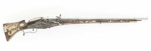Keywords: Hjullåsmusköt - Livrustkammaren - 96392.tif LSH artwork sv Rund slätborrad pipa med åttsidig kammare avsmalnande mot mynningen där den åter vidgas Övergången till kammaren markerad med två band kammarens kanter med hålkälar Bakom siktet stämplat 7 Strax bakom mynningen två graverade linjer löpande runtom pipan Svansskruvplatta med vulst med tvärställda skåror Rakt rektangulärt svansskruvblad med sidorna markerade med linjer På kammarens ovansida stämplar på överfältet en oval stämpel R R ovanför sköld med bokstäverna I N och otydlig figur LRK vägl 1921 409 krönt stämpel Amsterdams kontroll LRK vägl 1921 296 Dessutom på vardera av de två omgivande fälten stämpel i form av en pistol LRK vägl 1921 264 <br/>Riktmedel Sikte och korn av stål <br/>Fästning Tre häften Pipan fäst medkrysskruv underifrån samt ett pipstift mellan av trä <br/>Hjullås av tysk typ med plant låsbleck Utvändigt hjul fäst med ring och skruvar kl 3 och 9 Nedanför hjulet stämpel D I tre femuddiga stjärnor samt månskära Fängpanna med låg rak skärm lock med rörlig arm avslutad med ett ekollon Fängpanneskruven liksom virvelsäkringsskruven med lövformigt bleck Virvelsäkringens tumgrepp ringformigt med liten knopp på ringens sida Hane med rektangulära käkar lös underkäke balusterformig kropp fyrsidigt käkskruvhuvud och hanhals Hanfjädern som alla fjädrar med fasningar och voluter Låset utvändigt och invändigt polerat spridd dekor gjord med snett hållen rörstämpel på hjulet i form av kors på hanhalsen som paragraftecken <br/>Fästning Två låsskruvar en saknas <br/>Rakavtryckare med band och kula <br/>Helstock av valnöt muskötkolv med utskuret tumgrepp framstock med sluten laddstocksränna Inläggningar av benlister och graverade benplattor Inläggningar på stockens h sida övre fältet kvinnofigur med skål i ena handen och remmare vid h sida Solskiva med mansansikte I övrigt bladrankor Nedre fältet bakåtblickande drake med en gång omslagen kropp V sida övre fältet kvinnofigur stående på piedestal med korintiskt kapitäl under v arm Bakplåten graverad med bladkrönt sköld En av ursprungligen fem benplattor vid kolvens bakkant graverad med volut och linjer Sidblecket fragmentariskt med jaktmotiv ryttare som avlossar musköt springande hund samt människa På v sida om svansskruvbladet benplata med manlig sjöjungfru med skägg och kvinnobröst Avtryckarblecket graverat med volut samt skrafferat Kolvens undersida har större inlagda blommor och bladrankor På framstocken urspr sex djur på vardera sidan På h sida hundar hjortar samt hare h sida hundar och hjort Näsbandet graverat med blad och linjer Varbygeln bakåt utdragen samt skålformig bakre stolpen spikad vid kolven stolpen nedåt utdragen i en kula original caption Hjullåsmusköt<br/> Nyckelord 1500-tal Föremålsbild Gevär Slaget vid Mitau 1596 steel e1247 - eldvapen - pipa lås riktmedel och beslag material stål - walnut e3 - eldvapen - stock material valnöt - bone e78 - eldvapen - stockbeslag och stockdekor material ben size mm 1305 size mm 955 pipa size mm 224 g 7550 LRK Gustav II Adolf av Sverige Krigsbyte 2007-2008 Amsterdams vapen Stöckelnr 1261/6039 anv e1 - eldvapen - pipa; anonym kontrollör D I måne o stjärnor anv e2 - eldvapen - lås; anonym låssmed pistol anv e1 - eldvapen - pipa; anonym pipsmed R R över sköld med I N anv e1 - eldvapen - pipa; anonym pipsmed place of origin Amsterdam original filename lm_dig10084 47704 inventory number LRK 11688 96392 CC-BY-SA Erik Lernestål Wheellock musket images from Livrustkammaren Photographs of weapons by Erik Lernestål Media contributed by LSH unmatched event Media contributed by LSH dim-with multiple size templates Media contributed by LSH 2014-11 |