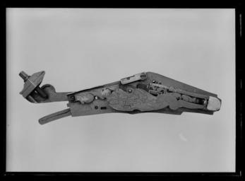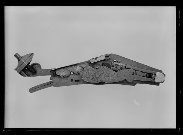 Keywords: Hjullåspistol, puffert, Nordtyskland (Braunschweig?) ca 1560-1570 - Livrustkammaren - 598.tif Rund pipa med svag trumf och åttsidig kammare kort försänkt i vinkel böjt svansskruvblad dolt av kolvplåten Pipans ovansida helt täckt av etsad och delvis förgylld dekor ett förgyllt tvärband i båda ändar på pipan och däremellan rankdekor mot prickbakgrund På den kantiga delen en förgylld man helbild profil h barett med plym midjekort mantel pluderhosor värja På den runda delen en kvinna helbild profil v lång veckad kjol med tvärbårder överdel med långa hängande ärmar kort plagg över axlarna v hand vid midjan h hand lyft framför ansiktet hållande spegel runt föremål med hundliknande drag skaft Båda figurerna står i fält som framtill avslutas med trepassformig båge med krön i form av fransk lilja Pipans undersida endast grovfilad <br/>Fästning Två häften Pipan fäst med krysskruv samt två pipstift av stål <br/><br/>Hjullås med plant låsbleck med delvis fasade kanter Låsblecket täckt av etsad dekor med bladrankor mot prickbakgrund kantbård av omväxlande tre runda och ett avlångt blankt fält Utvändigt hjul täckt av en rombisk platta och därpå stödram i form av två från nederkanten utstickande från varandra vända etsade drakhuvuden förenade dels nertill dels genom båge med prickdekor ovanför hjulaxeln Drakarna och den rombiska plattan fästade med en skruv genom vardera drakhuvudet Kantig fängpanna på ytterkanten och bakkanten en plan skiva med svängd kant som tillsammans med fängpannas lock bildar en halvcirkel fängpannelocket saknas På skivans ovansida hakan av en grotesk mask jfr nr 17584 På låsbleckets kant därframför en etsad bladranka <br/>Hane med rak kantig kropp på framsidan en utskjutande platta med rundad kant framför käkskruven lös överkäke med antydan till fingergrepp käkskruv med litet fyrsidigt huvud På hanens utsida grövre rankdekor samt antydan till drakhuvud på käkarna Hanfjäder med framtill rundad utsida filade bladrankor dubbelt kraftigt fjäderlöv med dekor som på hanen ena bladet nedanför hjulet det andra uppåtriktat <br/>Låset invändigt blankt Stor framtill konturerad täckplatta från avtryckare till hjulaxel odjurshuvud framtill Stångtanden saknas <br/>Säkring På låsbleckets bakre del en virvelsäkring L-formig bygel med lång profilerad främre arm avslutad med stort fjäderlöv bakom bygeln ett löv som täcker hela låsbleckets plana del och tvär avslutas vid tungan som skjuts in under kolvplåten Säkring med rinformigt platt grepp profilerad fjäder med dubbelt fjäderlöv som hanfjäderns Fästning Två låsskruvar den bakre samtidigt fästskruv för bältehaken <br/>Avtryckare Rak avtryckare fäst med skruv i kolvplåten <br/><br/>Helstock av stål med i vinkel böjd kolv avslutad med kolvkula kolvkulan delad i två halvor förenade med gångjärn på undersidan fjädrande spärr som nås genom hål i kolvkulan Kolvhalsen rundad framtill en ring med pärlstavsdekor Låsdelen av kolven samt framstocken kantiga sluten laddstocksränna framstocken därframför rundad <br/>Heltäckande etsad dekor i fält åtskilda av blanka linjer fältens botten prickad därpå rankmönster dekoren uppbygd på samma sätt som på nr 17583 men något avvikande utförande På kolvkulans yttre del bladrankor amt ovanför mittknappen en tom renässanssköld sköldhållare två lejon På kolvkulans fasta del dekor i form av stora flikiga framåtriktade blad På kolvhalsens runda del fem rektangulära fält på ovansidan två med en naken man i det ena och en naken kvinna i det andra halvt vända mot varandra draperingar över skötena På sidorna ytterligare en naken kvinna vänd mot mannen samt på den andra sidan en naken man på undersidan en naken kvinna På kolvryggen därframför fram till pipan ett stort fält med en man i helfigur profil v pluderhosor åtsittande jacka på huvudet en hög hatt med fjäder v hand vid midjan h hand lyft hållande spjut Hela anslagssidan av stocken täcks av ett sotrt fält med bladrankor samt mellan låsskruvarna en ryttare vänd framåt hög hatt med plym dräkt med pluderhosor bakom ryttaren en hund framför honom en hare en hund och en hare samma som på parpistolen men med avvikande hållning och detaljer På kolvens undersida ett fät runt avtryckaren samt ett fält därframför med bladrankor samt två fåglar den sittande papegojan placerad vid varbygelns fästskruv omvänd placering mot parpistolens På laddstocksrännan längsgående dekor i form av en bladranka hund och hare Som överrörka och näsband ett tvärband med förgylld rankdekor I övrigt har samtliga större figurmotiv rester av förgyllning <br/><br/>Tillbehör <br/>Laddstock av stål l 318 mm original caption ca other date - 1560 1570 steel e1237 - eldvapen - pipa lås stock och beslag material stål - wood e9 - eldvapen - laddstock material trä g 2200 size mm 341 pipa size mm 539 LRK Gustav II Adolf av Sverige Erik XIV av Sverige Tre Konungar på Åbo slott 1993 place of origin original filename LN_B03100_005980 54179 inventory number LRK 17584 598 CC0 Hjullåspistol puffert Nordtyskland Braunschweig ca 1560-1570 - Livrustkammaren - 598-negative tif Pistol images from Livrustkammaren Media contributed by LSH dim-with multiple size templates Media contributed by LSH 2013-10 |