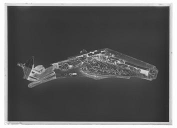 Keywords: Hjullåspistol, puffert, Nordtyskland (Braunschweig?) ca 1560-1570 - Livrustkammaren - 26246-negative.tif Rund pipa med svag trumf och åttsidig kammare kort försänkt i vinkel böjt svansskruvblad dolt av kolvplåten Pipans ovansida helt täckt av etsad och delvis förgylld dekor ett förgyllt tvärband i båda ändar på pipan och däremellan rankdekor mot prickbakgrund På den kantiga delen en förgylld man helbild profil h barett med plym midjekort mantel pluderhosor värja På den runda delen en kvinna helbild profil v lång veckad kjol med tvärbårder överdel med långa hängande ärmar kort plagg över axlarna v hand vid midjan h hand lyft framför ansiktet hållande spegel runt föremål med hundliknande drag skaft Båda figurerna står i fält som framtill avslutas med trepassformig båge med krön i form av fransk lilja Pipans undersida endast grovfilad <br/>Fästning Två häften Pipan fäst med krysskruv samt två pipstift av stål <br/><br/>Hjullås med plant låsbleck med delvis fasade kanter Låsblecket täckt av etsad dekor med bladrankor mot prickbakgrund kantbård av omväxlande tre runda och ett avlångt blankt fält Utvändigt hjul täckt av en rombisk platta och därpå stödram i form av två från nederkanten utstickande från varandra vända etsade drakhuvuden förenade dels nertill dels genom båge med prickdekor ovanför hjulaxeln Drakarna och den rombiska plattan fästade med en skruv genom vardera drakhuvudet Kantig fängpanna på ytterkanten och bakkanten en plan skiva med svängd kant som tillsammans med fängpannas lock bildar en halvcirkel fängpannelocket saknas På skivans ovansida hakan av en grotesk mask jfr nr 17584 På låsbleckets kant därframför en etsad bladranka <br/>Hane med rak kantig kropp på framsidan en utskjutande platta med rundad kant framför käkskruven lös överkäke med antydan till fingergrepp käkskruv med litet fyrsidigt huvud På hanens utsida grövre rankdekor samt antydan till drakhuvud på käkarna Hanfjäder med framtill rundad utsida filade bladrankor dubbelt kraftigt fjäderlöv med dekor som på hanen ena bladet nedanför hjulet det andra uppåtriktat <br/>Låset invändigt svärtat Stor konturerad täckplatta från avtryckare till hjulaxel odjurshuvud framtill <br/>Säkring På låsbleckets bakre del en virvelsäkring L-formig bygel med lång profilerad främre arm avslutad med stort fjäderlöv bakom bygeln ett löv som täcker hela låsbleckets plana del och tvär avslutas vid tungan som skjuts in under kolvplåten Säkring med rinformigt platt grepp profilerad fjäder med dubbelt fjäderlöv som hanfjäderns Fästning Två låsskruvar den bakre samtidigt fästskruv för bältehaken <br/>Avtryckare Rak avtryckare fäst med skruv i kolvplåten <br/><br/>Helstock av stål med i vinkel böjd kolv avslutad med kolvkula kolvkulan delad i två halvor förenade med gångjärn på undersidan fjädrande spärr som nås genom hål i kolvkulan Kolvhalsen rundad framtill en ring med pärlstavsdekor Låsdelen av kolven samt framstocken kantiga sluten laddstocksränna framstocken därframför rundad <br/>Heltäckande etsad dekor i fält åtskilda av blanka linjer fältens botten prickad därpå rankmönster På kolvkulans yttre del bladrankor amt ovanför mittknappen en tom renässanssköld sköldhållare två lejon På kolvkulans fasta del dekor i form av stora flikiga framåtriktade blad På kolvhalsens runda del fem rektangulära fält på ovansidan två med en naken man i det ena och en naken kvinna i det andra halvt vända mot varandra draperingar över skötena På sidorna ytterligare en naken kvinna vänd mot mannen samt på den andra sidan en man i antik rustning och med kroksabel På undersidan en man likaså i antik rustning men med sköld stödd mot marken dessa två är vända mot varandra På kolvryggen därframför fram till pipan ett stort fält med en man i helfigur profil v antik rustning med lejonmaskaron på axeln pluderhosor på huvudet kaskett med plym v hand vid midjan h hand lyft hållande yxa Hela anslagssidan av stocken täcks av ett sotrt fält med bladrankor samt mellan låsskruvarna en ryttare vänd framåt hög hatt med plym dräkt med pluderhosor bakom ryttaren en hund framför honom en hare en hund och en hare På kolvens undersida ett fät runt avtryckaren samt ett fält därframför med bladrankor samt två fåglar d en främre en sittande papegoja På laddstocksrännan längsgående dekor i form av en bladranka hund och hare Som överrörka och näsband ett tvärband med förgylld rankdekor I övrigt har samtliga större figurmotiv rester av förgyllning <br/><br/>Tillbehör <br/>Laddstock av stål l 318 mm original caption ca other date - 1560 1570 steel e1279 - eldvapen - pipa lås stockbeslag och laddstock material stål g 2220 size mm 340 pipa size mm 544 LRK Erik XIV av Sverige Gustav II Adolf av Sverige Tre Konungar på Åbo slott 1993 place of origin original filename LN_B02753_005633 54178 inventory number LRK 17583 26246 CC0 Hjullåspistol puffert Nordtyskland Braunschweig ca 1560-1570 - Livrustkammaren - 26246 tif <gallery caption Different images of same object > File Hjullåspistol puffert Nordtyskland Braunschweig ca 1560-1570 - Livrustkammaren - 43271 tif File Hjullåspistol puffert Nordtyskland Braunschweig ca 1560-1570 - Livrustkammaren - 51981 tif </gallery> |