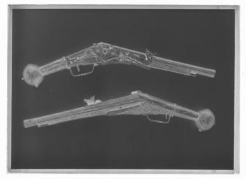 Keywords: Hjullåspistol, puffert, Nordtyskland (Braunschweig?) ca 1560-1570 - Livrustkammaren - 43271-negative.tif Rund pipa med svag trumf och åttsidig kammare kort försänkt i vinkel böjt svansskruvblad dolt av kolvplåten Pipans ovansida helt täckt av etsad och delvis förgylld dekor ett förgyllt tvärband i båda ändar på pipan och däremellan rankdekor mot prickbakgrund På den kantiga delen en förgylld man helbild profil h barett med plym midjekort mantel pluderhosor värja På den runda delen en kvinna helbild profil v lång veckad kjol med tvärbårder överdel med långa hängande ärmar kort plagg över axlarna v hand vid midjan h hand lyft framför ansiktet hållande spegel runt föremål med hundliknande drag skaft Båda figurerna står i fält som framtill avslutas med trepassformig båge med krön i form av fransk lilja Pipans undersida endast grovfilad <br/>Fästning Två häften Pipan fäst med krysskruv samt två pipstift av stål <br/><br/>Hjullås med plant låsbleck med delvis fasade kanter Låsblecket täckt av etsad dekor med bladrankor mot prickbakgrund kantbård av omväxlande tre runda och ett avlångt blankt fält Utvändigt hjul täckt av en rombisk platta och därpå stödram i form av två från nederkanten utstickande från varandra vända etsade drakhuvuden förenade dels nertill dels genom båge med prickdekor ovanför hjulaxeln Drakarna och den rombiska plattan fästade med en skruv genom vardera drakhuvudet Kantig fängpanna på ytterkanten och bakkanten en plan skiva med svängd kant som tillsammans med fängpannas lock bildar en halvcirkel fängpannelocket saknas På skivans ovansida hakan av en grotesk mask jfr nr 17584 På låsbleckets kant därframför en etsad bladranka <br/>Hane med rak kantig kropp på framsidan en utskjutande platta med rundad kant framför käkskruven lös överkäke med antydan till fingergrepp käkskruv med litet fyrsidigt huvud På hanens utsida grövre rankdekor samt antydan till drakhuvud på käkarna Hanfjäder med framtill rundad utsida filade bladrankor dubbelt kraftigt fjäderlöv med dekor som på hanen ena bladet nedanför hjulet det andra uppåtriktat <br/>Låset invändigt svärtat Stor konturerad täckplatta från avtryckare till hjulaxel odjurshuvud framtill <br/>Säkring På låsbleckets bakre del en virvelsäkring L-formig bygel med lång profilerad främre arm avslutad med stort fjäderlöv bakom bygeln ett löv som täcker hela låsbleckets plana del och tvär avslutas vid tungan som skjuts in under kolvplåten Säkring med rinformigt platt grepp profilerad fjäder med dubbelt fjäderlöv som hanfjäderns Fästning Två låsskruvar den bakre samtidigt fästskruv för bältehaken <br/>Avtryckare Rak avtryckare fäst med skruv i kolvplåten <br/><br/>Helstock av stål med i vinkel böjd kolv avslutad med kolvkula kolvkulan delad i två halvor förenade med gångjärn på undersidan fjädrande spärr som nås genom hål i kolvkulan Kolvhalsen rundad framtill en ring med pärlstavsdekor Låsdelen av kolven samt framstocken kantiga sluten laddstocksränna framstocken därframför rundad <br/>Heltäckande etsad dekor i fält åtskilda av blanka linjer fältens botten prickad därpå rankmönster På kolvkulans yttre del bladrankor amt ovanför mittknappen en tom renässanssköld sköldhållare två lejon På kolvkulans fasta del dekor i form av stora flikiga framåtriktade blad På kolvhalsens runda del fem rektangulära fält på ovansidan två med en naken man i det ena och en naken kvinna i det andra halvt vända mot varandra draperingar över skötena På sidorna ytterligare en naken kvinna vänd mot mannen samt på den andra sidan en man i antik rustning och med kroksabel På undersidan en man likaså i antik rustning men med sköld stödd mot marken dessa två är vända mot varandra På kolvryggen därframför fram till pipan ett stort fält med en man i helfigur profil v antik rustning med lejonmaskaron på axeln pluderhosor på huvudet kaskett med plym v hand vid midjan h hand lyft hållande yxa Hela anslagssidan av stocken täcks av ett sotrt fält med bladrankor samt mellan låsskruvarna en ryttare vänd framåt hög hatt med plym dräkt med pluderhosor bakom ryttaren en hund framför honom en hare en hund och en hare På kolvens undersida ett fät runt avtryckaren samt ett fält därframför med bladrankor samt två fåglar d en främre en sittande papegoja På laddstocksrännan längsgående dekor i form av en bladranka hund och hare Som överrörka och näsband ett tvärband med förgylld rankdekor I övrigt har samtliga större figurmotiv rester av förgyllning <br/><br/>Tillbehör <br/>Laddstock av stål l 318 mm original caption ca other date - 1560 1570 steel e1279 - eldvapen - pipa lås stockbeslag och laddstock material stål g 2220 size mm 340 pipa size mm 544 LRK Erik XIV av Sverige Gustav II Adolf av Sverige Tre Konungar på Åbo slott 1993 place of origin original filename LN_B01805_004685 54178 inventory number LRK 17583 43271 CC0 Hjullåspistol puffert Nordtyskland Braunschweig ca 1560-1570 - Livrustkammaren - 43271 tif <gallery caption Different images of same object > File Hjullåspistol puffert Nordtyskland Braunschweig ca 1560-1570 - Livrustkammaren - 26246 tif File Hjullåspistol puffert Nordtyskland Braunschweig ca 1560-1570 - Livrustkammaren - 51981 tif </gallery> Hjullåspistol, puffert, Nordtyskland (Braunschweig?) ca 1560-1570 - Livrustkammaren - 43271-negative.tif Rund pipa med svag trumf och åttsidig kammare kort försänkt i vinkel böjt svansskruvblad dolt av kolvplåten Pipans ovansida helt täckt av etsad och delvis förgylld dekor ett förgyllt tvärband i båda ändar på pipan och däremellan rankdekor mot prickbakgrund På den kantiga delen en förgylld man helbild profil h barett med plym midjekort mantel pluderhosor värja På den runda delen en kvinna helbild profil v lång veckad kjol med tvärbårder överdel med långa hängande ärmar kort plagg över a
