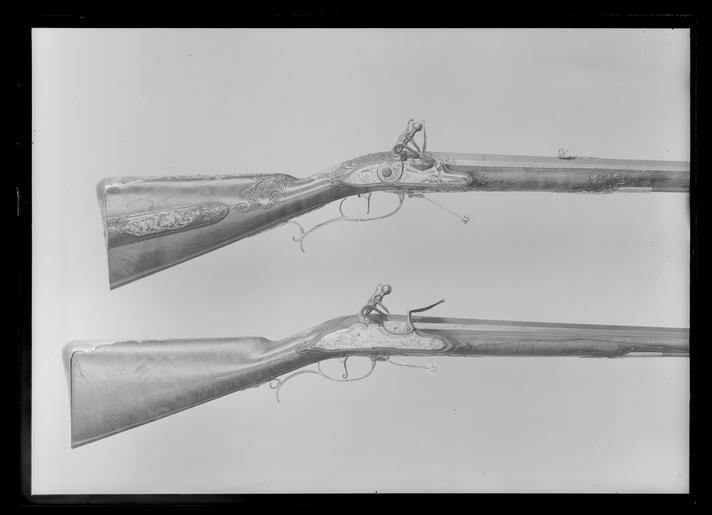 Keywords: Hjullåspistol, puffert, Nordtyskland (Braunschweig?) ca 1560-1570 - Livrustkammaren - 51981.tif Rund pipa med svag trumf och åttsidig kammare kort försänkt i vinkel böjt svansskruvblad dolt av kolvplåten Pipans ovansida helt täckt av etsad och delvis förgylld dekor ett förgyllt tvärband i båda ändar på pipan och däremellan rankdekor mot prickbakgrund På den kantiga delen en förgylld man helbild profil h barett med plym midjekort mantel pluderhosor värja På den runda delen en kvinna helbild profil v lång veckad kjol med tvärbårder överdel med långa hängande ärmar kort plagg över axlarna v hand vid midjan h hand lyft framför ansiktet hållande spegel runt föremål med hundliknande drag skaft Båda figurerna står i fält som framtill avslutas med trepassformig båge med krön i form av fransk lilja Pipans undersida endast grovfilad <br/>Fästning Två häften Pipan fäst med krysskruv samt två pipstift av stål <br/><br/>Hjullås med plant låsbleck med delvis fasade kanter Låsblecket täckt av etsad dekor med bladrankor mot prickbakgrund kantbård av omväxlande tre runda och ett avlångt blankt fält Utvändigt hjul täckt av en rombisk platta och därpå stödram i form av två från nederkanten utstickande från varandra vända etsade drakhuvuden förenade dels nertill dels genom båge med prickdekor ovanför hjulaxeln Drakarna och den rombiska plattan fästade med en skruv genom vardera drakhuvudet Kantig fängpanna på ytterkanten och bakkanten en plan skiva med svängd kant som tillsammans med fängpannas lock bildar en halvcirkel fängpannelocket saknas På skivans ovansida hakan av en grotesk mask jfr nr 17584 På låsbleckets kant därframför en etsad bladranka <br/>Hane med rak kantig kropp på framsidan en utskjutande platta med rundad kant framför käkskruven lös överkäke med antydan till fingergrepp käkskruv med litet fyrsidigt huvud På hanens utsida grövre rankdekor samt antydan till drakhuvud på käkarna Hanfjäder med framtill rundad utsida filade bladrankor dubbelt kraftigt fjäderlöv med dekor som på hanen ena bladet nedanför hjulet det andra uppåtriktat <br/>Låset invändigt svärtat Stor konturerad täckplatta från avtryckare till hjulaxel odjurshuvud framtill <br/>Säkring På låsbleckets bakre del en virvelsäkring L-formig bygel med lång profilerad främre arm avslutad med stort fjäderlöv bakom bygeln ett löv som täcker hela låsbleckets plana del och tvär avslutas vid tungan som skjuts in under kolvplåten Säkring med rinformigt platt grepp profilerad fjäder med dubbelt fjäderlöv som hanfjäderns Fästning Två låsskruvar den bakre samtidigt fästskruv för bältehaken <br/>Avtryckare Rak avtryckare fäst med skruv i kolvplåten <br/><br/>Helstock av stål med i vinkel böjd kolv avslutad med kolvkula kolvkulan delad i två halvor förenade med gångjärn på undersidan fjädrande spärr som nås genom hål i kolvkulan Kolvhalsen rundad framtill en ring med pärlstavsdekor Låsdelen av kolven samt framstocken kantiga sluten laddstocksränna framstocken därframför rundad <br/>Heltäckande etsad dekor i fält åtskilda av blanka linjer fältens botten prickad därpå rankmönster På kolvkulans yttre del bladrankor amt ovanför mittknappen en tom renässanssköld sköldhållare två lejon På kolvkulans fasta del dekor i form av stora flikiga framåtriktade blad På kolvhalsens runda del fem rektangulära fält på ovansidan två med en naken man i det ena och en naken kvinna i det andra halvt vända mot varandra draperingar över skötena På sidorna ytterligare en naken kvinna vänd mot mannen samt på den andra sidan en man i antik rustning och med kroksabel På undersidan en man likaså i antik rustning men med sköld stödd mot marken dessa två är vända mot varandra På kolvryggen därframför fram till pipan ett stort fält med en man i helfigur profil v antik rustning med lejonmaskaron på axeln pluderhosor på huvudet kaskett med plym v hand vid midjan h hand lyft hållande yxa Hela anslagssidan av stocken täcks av ett sotrt fält med bladrankor samt mellan låsskruvarna en ryttare vänd framåt hög hatt med plym dräkt med pluderhosor bakom ryttaren en hund framför honom en hare en hund och en hare På kolvens undersida ett fät runt avtryckaren samt ett fält därframför med bladrankor samt två fåglar d en främre en sittande papegoja På laddstocksrännan längsgående dekor i form av en bladranka hund och hare Som överrörka och näsband ett tvärband med förgylld rankdekor I övrigt har samtliga större figurmotiv rester av förgyllning <br/><br/>Tillbehör <br/>Laddstock av stål l 318 mm original caption ca other date - 1560 1570 steel e1279 - eldvapen - pipa lås stockbeslag och laddstock material stål g 2220 size mm 340 pipa size mm 544 LRK Erik XIV av Sverige Gustav II Adolf av Sverige Tre Konungar på Åbo slott 1993 place of origin original filename LN_B03306_006186 54178 inventory number LRK 17583 51981 CC0 Hjullåspistol puffert Nordtyskland Braunschweig ca 1560-1570 - Livrustkammaren - 51981-negative tif <gallery caption Different images of same object > File Hjullåspistol puffert Nordtyskland Braunschweig ca 1560-1570 - Livrustkammaren - 43271 tif File Hjullåspistol puffert Nordtyskland Braunschweig ca 1560-1570 - Livrustkammaren - 26246 tif </gallery> Wheellock pistol images from Livrustkammaren Media contributed by LSH dim-with multiple size templates Media contributed by LSH 2013-10 Hjullåspistol, puffert, Nordtyskland (Braunschweig?) ca 1560-1570 - Livrustkammaren - 51981.tif Rund pipa med svag trumf och åttsidig kammare kort försänkt i vinkel böjt svansskruvblad dolt av kolvplåten Pipans ovansida helt täckt av etsad och delvis förgylld dekor ett förgyllt tvärband i båda ändar på pipan och däremellan rankdekor mot prickbakgrund På den kantiga delen en förgylld man helbild profil h barett med plym midjekort mantel pluderhosor värja På den ru