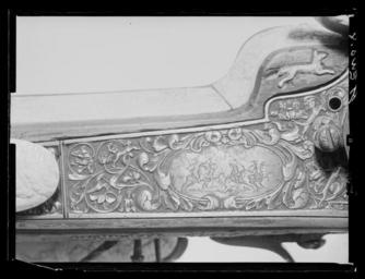 Keywords: Hjullåsstudsare, Westphalen ca 1660 - Livrustkammaren - 71153.tif LSH artwork sv Åttsidig sjuräfflad pipa bombredd 2 8 mm Rektangulärt svansskruvblad På kammaren en sköldformig stämpel med hand och därovanför tre otydliga bokstäver G H N LRK vägl 1921 155 Dekor i form av graverade blomrankor på kammaren runt siktet och bakom kornet På kammaren dessutom ett fält med landskap med en hjort och två hundar Riktmedel Ståndsikte av stål med bred u-formig skärm Spolformigt korn av mässing båda inlaxade två laxningar för siktet Fästning Pipan fäst med krysskruv underifrån främre varbygelskruven samt tre pipstift av trä Hjullås av tysk typ plant låsbleck l 205 mm Dekor i form av graverade blomrankor i låg relief mot mörkskrafferad bakgrund Bakom hjulet ett ovalt fält med landskap med en kavalleristrid Utanpåliggande hjul fäst med halvcirkelformig uppåt breddad ring fäst med två skruvar kl 3 och 9 Svängd eldskärm avslutad med horisontell hjärtformig spets Fängpannelock med rörlig arm lockets framkant fasad och försedd med graverad dekor svängt rundat fingergrepp framtill avslutat med ett treflikigt blad Hane med fyrsidig kropp med rundad räfflad utsida ringformig hanhals med stor skärm lös överkäke Hals och käkar graverade som fågelhuvuden Uppåtböjt fingergrepp avslutat med en rund platt med spiralgravering Käkskruv med fyrsidigt huvud upptill koniskt med kulformig avslutning Hanfjäder med fasade kanter konturerad studel med glasögonformig genombrytning Avtryckarstången och fängpannelockets stoppfjädrar blånerade Fästning Två låsskruvar Avtryckare med konturerat och profilerat snälltryck Helstock av rödmålat trä rödbok nästan helt täckt med elfenbensplattor med snidad dekor Kolv av tysk typ med kolvlåda och vinge framtill avslutad med volut Den snidade dekoren föreställer landskap med jaktscener se Hellner Kolvlådelock av elfenben Bakplåt av elfenben med en satyr Kolvkula av stål Spetsrörka av elfenben med maskaron Bred varbygel av stål med tre fingerlägen korta genombrutna armar på bygeln graverad rankdekor samt ovalt fält med landskap med jägare hund och hjort Tillbehör Laddstock av rödmålat trä l 781 mm i ena änden ett invändigt gängat stålrör l 120 mm I den andra en benskoning l 42 Plattan kommer fram ur munnen på ett snidat fiskhuvud Gåva till Karl XI från landshövdingen friherre Augustin Leijonsköld 1634-1682 original caption ca 1660 steel e1247 - eldvapen - pipa lås riktmedel och beslag material stål - brass e4 - eldvapen - riktmedel material mässing - ivory e78 - eldvapen - stockbeslag och stockdekor material elfenben - beech e3 - eldvapen - stock material rödbok g 4280 size mm 774 pipa size mm 1068 LRK Karl XI av Sverige Augustin Leijonsköld basutställning Gallica 1945 Livrustkammarens basutställning 1978 Krigets prakt 2003-2004 place of origin DE Westphalia original filename LN_E05434 39530 inventory number LRK 2920 71153 CC0 Hjullåsstudsare Westphalen ca 1660 - Livrustkammaren - 71153-negative tif <gallery caption Different images of same object > File Hjullåsstudsare - Livrustkammaren - 95341 tif File Hjullåsstudsare Westphalen ca 1660 - Livrustkammaren - 43315 tif File Hjullåsstudsare Westphalen ca 1660 - Livrustkammaren - 10506 tif File Hjullåsstudsare Westphalen ca 1660 - Livrustkammaren - 27630 tif File Hjullåsstudsare Westphalen ca 1660 - Livrustkammaren - 19068 tif File Hjullåsstudsare Westphalen ca 1660 - Livrustkammaren - 10775 tif File Hjullåsstudsare Westphalen ca 1660 - Livrustkammaren - 78992 tif File Hjullåsstudsare Westphalen ca 1660 - Livrustkammaren - 44749 tif File Hjullåsstudsare Westphalen ca 1660 - Livrustkammaren - 60420 tif File Hjullåsstudsare Westphalen ca 1660 - Livrustkammaren - 1946 tif File Hjullåsstudsare Westphalen ca 1660 - Livrustkammaren - 26180 tif File Hjullåsstudsare Westphalen ca 1660 - Livrustkammaren - 61870 tif File Hjullåsstudsare - Livrustkammaren - 51368 tif File Hjullåsstudsare Westphalen ca 1660 - Livrustkammaren - 53310 tif File Hjullåsstudsare Westphalen ca 1660 - Livrustkammaren - 1945 tif File Hjullåsstudsare Westphalen ca 1660 - Livrustkammaren - 36191 tif File Hjullåsstudsare Westphalen ca 1660 - Livrustkammaren - 78991 tif File Hjullåsstudsare Westphalen ca 1660 - Livrustkammaren - 78990 tif File Hjullåsstudsare Westphalen ca 1660 - Livrustkammaren - 60464 tif File Hjullåsstudsare Westphalen ca 1660 - Livrustkammaren - 77541 tif File Hjullåsstudsare Westphalen ca 1660 - Livrustkammaren - 70431 tif File Hjullåsstudsare Westphalen ca 1660 - Livrustkammaren - 61871 tif File Hjullåsstudsare Westphalen ca 1660 - Livrustkammaren - 60459 tif File Hjullåsstudsare Karl XI - Livrustkammaren - 31010 tif File Hjullåsstudsare Westphalen ca 1660 - Livrustkammaren - 53309 tif File Hjullåsstudsare Westphalen ca 1660 - Livrustkammaren - 70432 tif File Hjullåsstudsare Westphalen ca 1660 - Livrustkammaren - 70433 tif </gallery> Muskets Media contributed by LSH dim-with multiple size templates Media contributed by LSH 2016-12 |