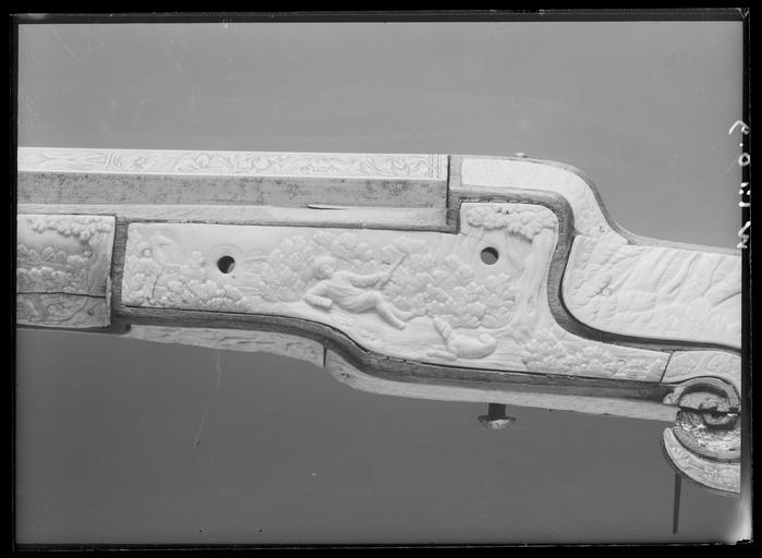 Keywords: Hjullåsstudsare, Westphalen ca 1660 - Livrustkammaren - 70433.tif LSH artwork sv Åttsidig sjuräfflad pipa bombredd 2 8 mm Rektangulärt svansskruvblad På kammaren en sköldformig stämpel med hand och därovanför tre otydliga bokstäver G H N LRK vägl 1921 155 Dekor i form av graverade blomrankor på kammaren runt siktet och bakom kornet På kammaren dessutom ett fält med landskap med en hjort och två hundar Riktmedel Ståndsikte av stål med bred u-formig skärm Spolformigt korn av mässing båda inlaxade två laxningar för siktet Fästning Pipan fäst med krysskruv underifrån främre varbygelskruven samt tre pipstift av trä Hjullås av tysk typ plant låsbleck l 205 mm Dekor i form av graverade blomrankor i låg relief mot mörkskrafferad bakgrund Bakom hjulet ett ovalt fält med landskap med en kavalleristrid Utanpåliggande hjul fäst med halvcirkelformig uppåt breddad ring fäst med två skruvar kl 3 och 9 Svängd eldskärm avslutad med horisontell hjärtformig spets Fängpannelock med rörlig arm lockets framkant fasad och försedd med graverad dekor svängt rundat fingergrepp framtill avslutat med ett treflikigt blad Hane med fyrsidig kropp med rundad räfflad utsida ringformig hanhals med stor skärm lös överkäke Hals och käkar graverade som fågelhuvuden Uppåtböjt fingergrepp avslutat med en rund platt med spiralgravering Käkskruv med fyrsidigt huvud upptill koniskt med kulformig avslutning Hanfjäder med fasade kanter konturerad studel med glasögonformig genombrytning Avtryckarstången och fängpannelockets stoppfjädrar blånerade Fästning Två låsskruvar Avtryckare med konturerat och profilerat snälltryck Helstock av rödmålat trä rödbok nästan helt täckt med elfenbensplattor med snidad dekor Kolv av tysk typ med kolvlåda och vinge framtill avslutad med volut Den snidade dekoren föreställer landskap med jaktscener se Hellner Kolvlådelock av elfenben Bakplåt av elfenben med en satyr Kolvkula av stål Spetsrörka av elfenben med maskaron Bred varbygel av stål med tre fingerlägen korta genombrutna armar på bygeln graverad rankdekor samt ovalt fält med landskap med jägare hund och hjort Tillbehör Laddstock av rödmålat trä l 781 mm i ena änden ett invändigt gängat stålrör l 120 mm I den andra en benskoning l 42 Plattan kommer fram ur munnen på ett snidat fiskhuvud Gåva till Karl XI från landshövdingen friherre Augustin Leijonsköld 1634-1682 original caption ca 1660 steel e1247 - eldvapen - pipa lås riktmedel och beslag material stål - brass e4 - eldvapen - riktmedel material mässing - ivory e78 - eldvapen - stockbeslag och stockdekor material elfenben - beech e3 - eldvapen - stock material rödbok g 4280 size mm 774 pipa size mm 1068 LRK Karl XI av Sverige Augustin Leijonsköld basutställning Gallica 1945 Livrustkammarens basutställning 1978 Krigets prakt 2003-2004 place of origin DE Westphalia original filename LN_B16598_019478 39530 inventory number LRK 2920 70433 CC0 Hjullåsstudsare Westphalen ca 1660 - Livrustkammaren - 70433-negative tif <gallery caption Different images of same object > File Hjullåsstudsare - Livrustkammaren - 95341 tif File Hjullåsstudsare Westphalen ca 1660 - Livrustkammaren - 43315 tif File Hjullåsstudsare Westphalen ca 1660 - Livrustkammaren - 10506 tif File Hjullåsstudsare Westphalen ca 1660 - Livrustkammaren - 27630 tif File Hjullåsstudsare Westphalen ca 1660 - Livrustkammaren - 19068 tif File Hjullåsstudsare Westphalen ca 1660 - Livrustkammaren - 10775 tif File Hjullåsstudsare Westphalen ca 1660 - Livrustkammaren - 78992 tif File Hjullåsstudsare Westphalen ca 1660 - Livrustkammaren - 44749 tif File Hjullåsstudsare Westphalen ca 1660 - Livrustkammaren - 60420 tif File Hjullåsstudsare Westphalen ca 1660 - Livrustkammaren - 1946 tif File Hjullåsstudsare Westphalen ca 1660 - Livrustkammaren - 26180 tif File Hjullåsstudsare Westphalen ca 1660 - Livrustkammaren - 61870 tif File Hjullåsstudsare - Livrustkammaren - 51368 tif File Hjullåsstudsare Westphalen ca 1660 - Livrustkammaren - 53310 tif File Hjullåsstudsare Westphalen ca 1660 - Livrustkammaren - 1945 tif File Hjullåsstudsare Westphalen ca 1660 - Livrustkammaren - 36191 tif File Hjullåsstudsare Westphalen ca 1660 - Livrustkammaren - 78991 tif File Hjullåsstudsare Westphalen ca 1660 - Livrustkammaren - 78990 tif File Hjullåsstudsare Westphalen ca 1660 - Livrustkammaren - 60464 tif File Hjullåsstudsare Westphalen ca 1660 - Livrustkammaren - 77541 tif File Hjullåsstudsare Westphalen ca 1660 - Livrustkammaren - 70431 tif File Hjullåsstudsare Westphalen ca 1660 - Livrustkammaren - 71153 tif File Hjullåsstudsare Westphalen ca 1660 - Livrustkammaren - 61871 tif File Hjullåsstudsare Westphalen ca 1660 - Livrustkammaren - 60459 tif File Hjullåsstudsare Karl XI - Livrustkammaren - 31010 tif File Hjullåsstudsare Westphalen ca 1660 - Livrustkammaren - 53309 tif File Hjullåsstudsare Westphalen ca 1660 - Livrustkammaren - 70432 tif </gallery> Muskets Media contributed by LSH dim-with multiple size templates Media contributed by LSH 2016-12