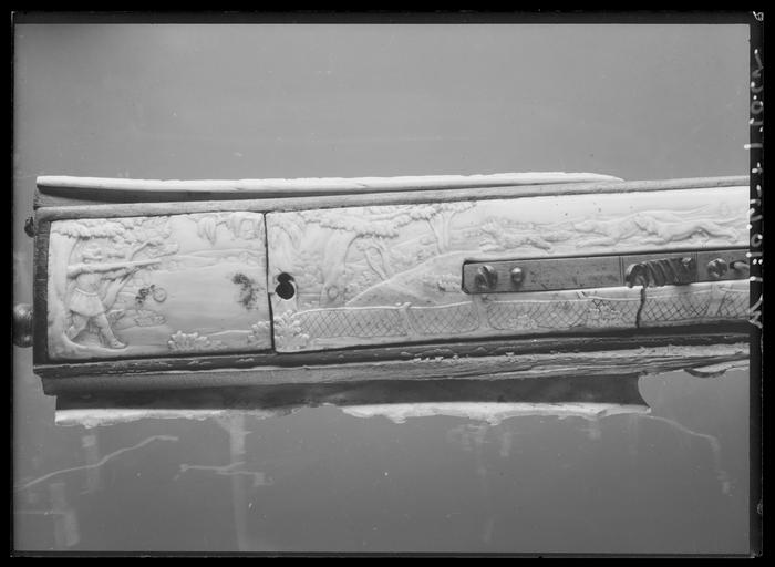 Keywords: Hjullåsstudsare, Westphalen cirka 1660 - Livrustkammaren - 53308.tif LSH artwork sv Åttsidig sjuräfflad pipa bombredd 2 8 mm Rektangulärt svansskruvblad På kammaren en sköldformig stämpel med hand och därovanför tre otydliga bokstäver G H N LRK vägl 1921 155 Dekor i form av graverade blomrankor på kammaren runt siktet och bakom kornet På kammaren dessutom ett fält med landskap med en man och fyra springande hundar Riktmedel Ståndsikte av stål med bred u-formig skärm Spolformigt korn av mässing båda inlaxade Fästning Pipan fäst med krysskruv underifrån främre varbygelskruven samt tre pipstift av trä Hjullås av tysk typ plant låsbleck l 205 mm Dekor i form av graverade blomrankor i låg relief mot mörkskrafferad bakgrund Bakom hjulet ett ovalt fält med landskap däri ryttare som förföljer en springande hjort två hundar Utanpåliggande hjul fäst med halvcirkelformig uppåt breddad ring fäst med två skruvar kl 3 och 9 Svängd eldskärm avslutad med horisontell hjärtformig spets Fängpannelock med rörlig arm lockets framkant fasad och försedd med graverad dekor svängt rundat fingergrepp framtill avslutat med ett treflikigt blad Hane med fyrsidig kropp med rundad räfflad utsida ringformig hanhals med stor skärm lös överkäke Hals och käkar graverade som fågelhuvuden Uppåtböjt fingergrepp avslutat med en rund platt med spiralgravering Käkskruv med fyrsidigt huvud upptill koniskt med kulformig avslutning Hanfjäder med fasade kanter konturerad studel med glasögonformig genombrytning Avtryckarstången och fängpannelockets stoppfjädrar blånerade Fästning Två låsskruvar Avtryckare med konturerat och profilerat snälltryck Helstock av rödmålat trä rödbok nästan helt täckt med elfenbensplattor med snidad dekor Kolv av tysk typ med kolvlåda och vinge framtill avslutad med volut Den snidade dekoren föreställer landskap med jaktscener se Hellner Kolvlådelock av elfenben Kolvkula av stål Spetsrörka av elfenben med maskaron Topprörka och näsband samt bakplåten saknas Bred varbygel av stål med tre fingerlägen korta genombrutna armar på bygeln graverad rankdekor samt ovalt fält med landskap med jägare hund och hjort Tillbehör Laddstock av rödmålat trä l 742 mm i ena änden ett invändigt gängat stålrör l 119 mm Gåva till Karl XI från landshövdingen friherre Augustin Leijonsköld 1634-1682 original caption ca 1660 ivory e8 - eldvapen - stockdekor material elfenben - steel e1247 - eldvapen - pipa lås riktmedel och beslag material stål - brass e4 - eldvapen - riktmedel material mässing - beech e3 - eldvapen - stock material rödbok size mm 775 pipa size mm 1068 g 4430 LRK Karl XI av Sverige Augustin Leijonsköld Jakt 1973 Läckö slott Tre Karlar 1984-1985 Trofast - hov och tass i kunglig tjänst 2010-2011 Livrustkammaren Trogna vänner - Kungliga hästar och hundar 2011-2012 Museiverket/Finlands nationalmuseum basutställning G H N hand 1921 155 anv e1 - eldvapen - pipa; anonym pipsmed place of origin original filename LN_B16576_019456 39529 inventory number LRK 2919 53308 CC0 Hjullåsstudsare Westphalen cirka 1660 - Livrustkammaren - 53308-negative tif <gallery caption Different images of same object > File Bössa elfenben - Livrustkammaren - 86497 tif File Hjullåsstudsare Westphalen cirka 1660 - Livrustkammaren - 19075 tif File Hjullåsstudsare Westphalen cirka 1660 - Livrustkammaren - 19100 tif File Hjullåsstudsare Westphalen cirka 1660 - Livrustkammaren - 36190 tif File Hjullåsstudsare Westphalen cirka 1660 - Livrustkammaren - 10505 tif File Hjullåsstudsare - Livrustkammaren - 95342 tif File Hjullåsstudsare Westphalen cirka 1660 - Livrustkammaren - 1978 tif File Hjullåsstudsare Westphalen cirka 1660 - Livrustkammaren - 19067 tif File Hjullåsstudsare Westphalen cirka 1660 - Livrustkammaren - 44747 tif File Hjullåsstudsare Westphalen cirka 1660 - Livrustkammaren - 61869 tif File Hjullåsstudsare Westphalen cirka 1660 - Livrustkammaren - 44748 tif File Hjullåsstudsare Westphalen cirka 1660 - Livrustkammaren - 10538 tif File Hjullåsstudsare Westphalen cirka 1660 - Livrustkammaren - 27629 tif File Bössa elfenben - Livrustkammaren - 86498 tif </gallery> Muskets Media contributed by LSH dim-with multiple size templates Media contributed by LSH 2016-12 |
