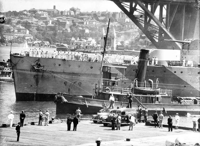 Keywords: b&w photograph bwphotograph dock foreshore historical naval navy people sailors ships sydney sydney harbour sydneyharbour transportation royal australian navy royalaustraliannavy naval vessel navalvessel naval personnel navalpersonnel naval officers navalofficers movietone movietone news movietonenews cinesound hmas sydney hmassydney samuel j hood collection samueljhoodcollection hood collection hoodcollection hood circular quay circularquay east circular quay eastcircularquay sydney harbour bridge sydneyharbourbridge heroine ship warship ran hmas sydney (d48) hmassydneyd48 d48 leander-class leanderclass light cruiser lightcruiser cruiser sunk sunk by kormoran sunkbykormoran kormoran (hsk-8) kormoranhsk8 kormoran hsk-8 hsk8 tug blackandwhite monochrome outdoor black and white HMAS SYDNEY is seen mooring against the backdrop of the Sydney Harbour Bridge after returning from the Mediterranean Sea and service with the 7th Cruiser Squadron. Visible on SYDNEY's port side is the geometric, dazzle paint scheme that was put on immediately after the Cape Spada action against Italian cruiser BARTOLOMEO COLLEONI. The arrival of this battle-weary ship was recorded by Cinesound and Fox Movietone, both of whose vans can be seen in the foreground. This photo is part of the Australian National Maritime Museum’s Samuel J. Hood Studio collection. Sam Hood (1872-1953) was a Sydney photographer with a passion for ships. His 60-year career spanned the romantic age of sail and two world wars. The photos in the collection were taken mainly in Sydney and Newcastle during the first half of the 20th century. The ANMM undertakes research and accepts public comments that enhance the information we hold about images in our collection. This record has been updated accordingly. Photographer: Samuel J. Hood Studio Collection Object no. 00020363 HMAS SYDNEY is seen mooring against the backdrop of the Sydney Harbour Bridge after returning from the Mediterranean Sea and service with the 7th Cruiser Squadron. Visible on SYDNEY's port side is the geometric, dazzle paint scheme that was put on immediately after the Cape Spada action against Italian cruiser BARTOLOMEO COLLEONI. The arrival of this battle-weary ship was recorded by Cinesound and Fox Movietone, both of whose vans can be seen in the foreground. This photo is part of the Australian National Maritime Museum’s Samuel J. Hood Studio collection. Sam Hood (1872-1953) was a Sydney photographer with a passion for ships. His 60-year career spanned the romantic age of sail and two world wars. The photos in the collection were taken mainly in Sydney and Newcastle during the first half of the 20th century. The ANMM undertakes research and accepts public comments that enhance the information we hold about images in our collection. This record has been updated accordingly. Photographer: Samuel J. Hood Studio Collection Object no. 00020363