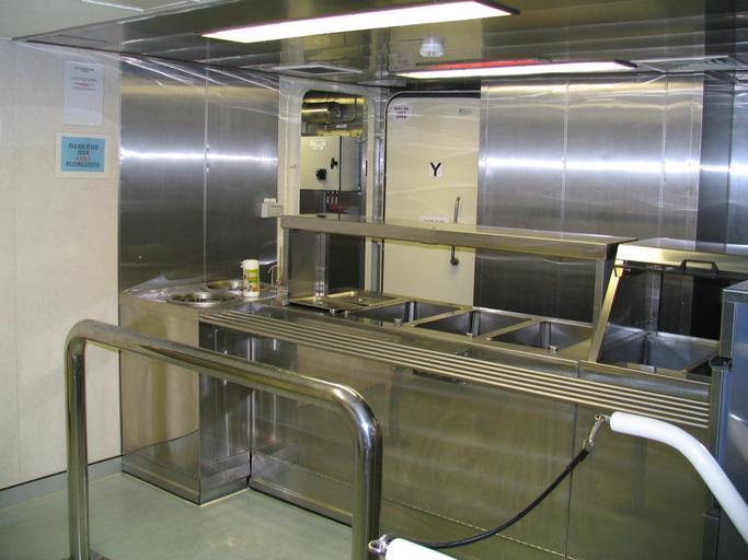 Keywords: HMNZS Otago servery.JPG en A servery scullery aboard the HMNZS Otago P148 taken while the ship was on a port visit to Dunedin New Zealand own Benchill 2010-07-25 Galleys kitchen HMNZS Otago P148