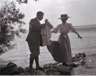 Keywords: lakes clothes hats 1900s outdoor blackandwhite black and white "Aileen & Mr Freer at Duck Lodge, July 09" Man and woman at the side of a lake. Photograph taken in July 1909. Aileen may be Aileen Rathbun, born 1875, wife of the photographer's elder half-brother, Edward Walter Rathbun. "Aileen & Mr Freer at Duck Lodge, July 09" Man and woman at the side of a lake. Photograph taken in July 1909. Aileen may be Aileen Rathbun, born 1875, wife of the photographer's elder half-brother, Edward Walter Rathbun. |
