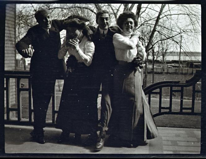Keywords: 1900s rathbun family rathbunfamily clothes women men “J. Gzowski, B. Caldwell, M. Braithwaite, Adrian Apl 11/09” John Gzowski, Betty Caldwell, M. [possibly Marjorie?] Braithwaite, Adrian Rathbun. One of a series of photographs taken on the veranda of the Rathbun house in Main Street, Deseronto, Ontario, on 11 April 1909. “J. Gzowski, B. Caldwell, M. Braithwaite, Adrian Apl 11/09” John Gzowski, Betty Caldwell, M. [possibly Marjorie?] Braithwaite, Adrian Rathbun. One of a series of photographs taken on the veranda of the Rathbun house in Main Street, Deseronto, Ontario, on 11 April 1909. |