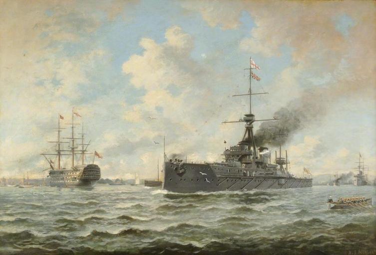 | Keywords: HMS Dreadnought and Victory by Henry J Morgan.jpg 'Dreadnought' and 'Victory' at Portsmouth by Henry J Morgan Date Painted 1907 Oil on canvas 80 x 110 cm Collection HMS Excellent <br>This version from http //www bbc co uk/arts/yourpaintings/paintings/dreadnought-and-victory-at-portsmouth-26057 1907 Henry J Morgan PD-Art Henry J Morgan Dreadnought HMS Dreadnought ship 1906 HMS Victory ship 1765 in art Images from BBC Your Paintings Battleships in art Dreadnought Naval ships of the United Kingdom in art |