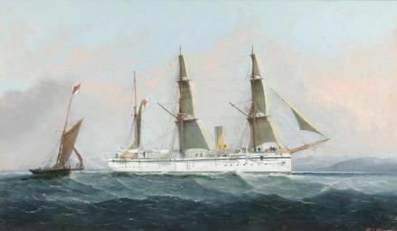 Keywords: HMS Wanderer by Henry J Morgan.jpg en HMS 'Wanderer' 1887 “1891 Collection Portsmouth Museums and Records Service <br>This version from http //www bbc co uk/arts/yourpaintings/paintings/hms-wanderer-18871891-24666 Portsmouth Museums and Records Service 1887-1891 Oil on canvas cm 35 60 1946/232 credit line gift from Miss E Giffard 1946 Henry J Morgan 1839 - 1917 PD-old-auto-1923 1917 DEFAULTSORT Wanderer Henry J Morgan Dolphin class gunvessel Wanderer Images from BBC Your Paintings |