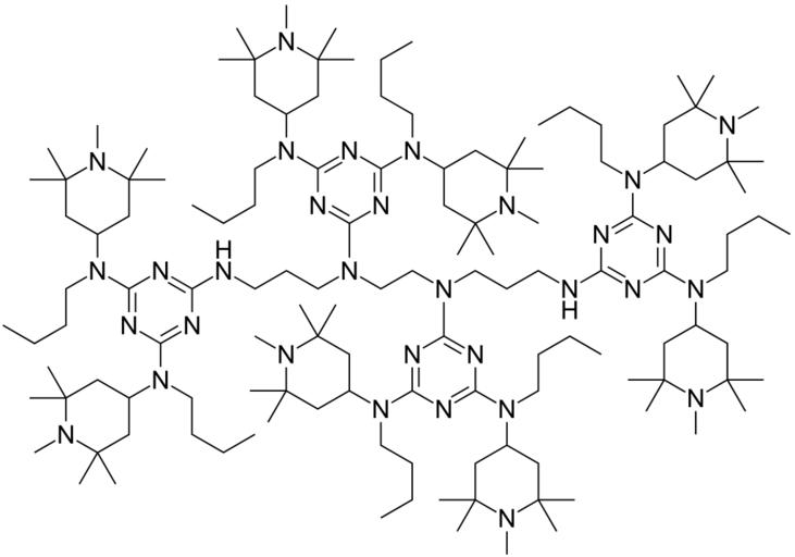 | Keywords: HMW-HA(L)S-4 100.svg validSVG Structure of N2 N2'- ethane-1 2-diyl bis N2- 3- 4 6-bis butyl 1 2 2 6 6-pentamethylpiperidin-4-yl amino -1 3 5-triazin-2-yl amino propyl -N4 N6-dibutyl-N4 N6-bis 1 2 2 6 6-pentamethylpiperidin-4-yl -1 3 5-triazine-2 4 6-triamine Own 2014-03-22 Emeldir <span class signature-talk >talk</span> Chemical structure verified https //upload wikimedia org/wikipedia/commons/b/b3/HMW-HA 28L 29S-4_100 svg 1S/C132H250N32/c1-49-57-71-157 97-81-117 9 10 147 41 118 11 12 82-97 109-135-105 136-110 143-109 158 72-58-50-2 98-83-119 13 14 148 42 120 15 16 84-98 133-67-65-69-155 107-139-113 161 75-61-53-5 101-89-125 25 26 151 45 126 27 28 90-101 145-114 140-107 162 76-62-54-6 102-91-127 29 30 152 46 128 31 32 92-102 79-80-156 108-141-115 163 77-63-55-7 103-93-129 33 34 153 47 130 35 36 94-103 146-116 142-108 164 78-64-56-8 104-95-131 37 38 154 48 132 39 40 96-104 70-66-68-134-106-137-111 159 73-59-51-3 99-85-121 17 18 149 43 122 19 20 86-99 144-112 138-106 160 74-60-52-4 100-87-123 21 22 150 44 124 23 24 88-100/h97-104H 49-96H2 1-48H3 H 133 135 136 143 H 134 137 138 144 OWXXKGVQBCBSFJ-UHFFFAOYSA-N 106990-43-6 PD-chem Aging inhibitors |