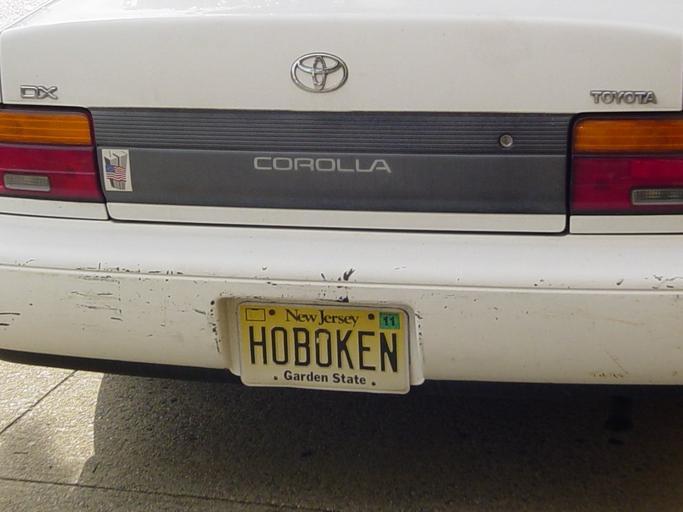 Keywords: Hoboken-license-plate-mmr.jpg en New Jersey license plate that says HOBOKEN own Matthewrutledge 2004-08-10 Toyota Corolla E100 License plates of New Jersey Art and culture of Hoboken New Jersey
