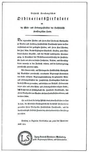 Keywords: Hochstift Konstanz Übergang an Baden 1802.jpg Bischöfliches Rundschreiben zum à bergang des Hochstifts Konstanz an Baden vom 30 November 1802 Generallandesarchiv Karlsruhe 48/5632 scan from Die Bischöfe von Konstanz ISBN 3-922137-48-2 1802 Ignaz Heinrich von Wessenberg PD-old-100 Ignaz Heinrich von Wessenberg 1802 in Germany Bishopric of Constance Die Bischöfe von Konstanz |