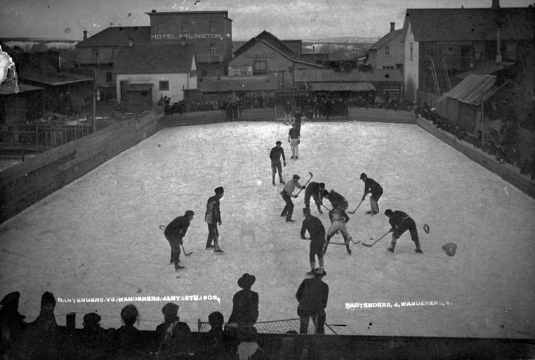 | Keywords: hockey alberta ice hockey icehockey blackandwhite monochrome black and white The Wanderers vs. the Bartenders. Final score: Wanderers 9, Bartenders 4. 12 January 1906. A10498. The Wanderers vs. the Bartenders. Final score: Wanderers 9, Bartenders 4. 12 January 1906. A10498. |