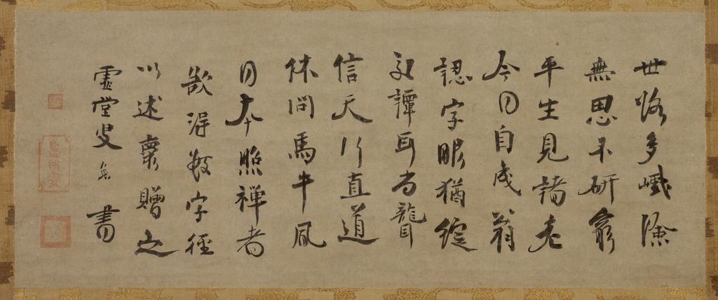 Keywords: Hogo Xutang Zhiyu.jpg en Teaching on Enlightenment 法語 hōgo Dedicated to a brilliant Zen practitioner possibly Mushō Jōshō 無象 照 1234 1306 One hanging scroll ink on paper 28 5 × 70 0 cm 11 2 × 27 6 in Located at the Tokyo National Museum Tokyo http //www emuseum jp/detail/100222/000/000 mode detail d_lang en s_lang en class 2 title c_e region era century cptype owner pos 33 num 8 Emuseum Xutang Zhiyu century 13 PD-Art National Treasures of Japan writings Calligraphy in the Tokyo National Museum Chinese calligraphy Zen Buddhism |