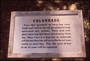 Keywords: HOH RAIN FOREST, WHERE SITKA SPRUCE WESTERN RED CEDAR, AND DOUGLAS FIR GROW TO GREAT SIZE - NARA - 545276.jpg A sign in the Hoh Rain Forest titled Colonnade ; it reads as follows <blockquote> Trees that germinate on nurse logs eventually send roots to the soil growing into large buttressed root systems These arch over ghost nurse logs that have rotted away Some day these trees in a long row or colonnade will fall and they too will serve the forest community as nurse logs Thus the cycle of hundreds of years will be repeated </blockquote> 545276 Local identifier 412-DA-2783 Environmental Protection Agency 12/02/1970 - Daniels Gene photographer Photographer 8463941 <br /> Still Picture Records Section Special Media Archives Services Division NWCS-S National Archives at College Park 8601 Adelphi Road College Park MD 20740-6001 1972-08 Record group Record Group 412 Records of the Environmental Protection Agency 1944 - 2006 Record group ARC 708 DOCUMERICA The Environmental Protection Agency's Program to Photographically Document Subjects of Environmental Concern compiled 1972 - 1977 Series ARC 542493 File unit File unit ARC Variant control numbers Agency-Assigned Identifier 047/23/002783<br /> NAIL Control Number NWDNS-412-DA-2783 Other versions <gallery> File HOH_RAIN_FOREST _WHERE_SITKA_SPRUCE_WESTERN_RED_CEDAR _AND_DOUGLAS_FIR_GROW_TO_GREAT_SIZE_-_NARA_-_545276 tif tif </gallery> NARA-cooperation PD-USGov Hoh Rain Forest Park signs in Washington state Tree signs in the United States Natural-features related signs Historical information signs in the United States Nurse logs Circle of life |