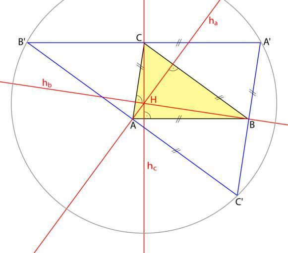 Keywords: Höhenschnittpunktbeweis.svg en Illustration to proof that the three altitudes intersect in a single point called the orthocenter of the triangle de Darstellung zum Beweis dass sich die Dreieckshöhen in einem Punkt schneiden Das umgebende Dreieck ist so konstruiert dass die Höhen des inneren Dreiecks die Mittelsenkrechten des umgebenden sind Entsprechend ist der Höhenschnittpunkt des Inneren Dreiecks der Umkreismittelpunkt des Äusseren own de File HöhenschnittpunktBeweis png Oldracoon 2010-12-03 SVG-Version des Bildes de File HöhenschnittpunktBeweis png Cc-zero Triangle's circles |