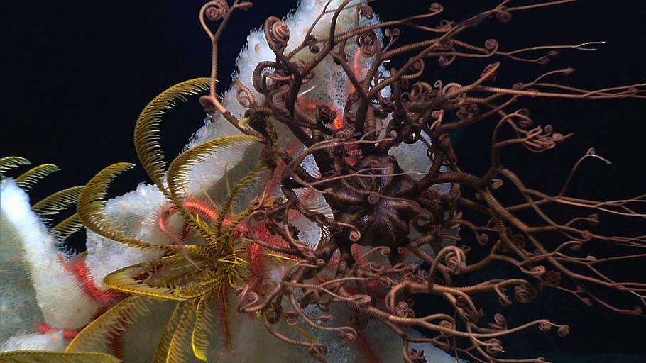 Keywords: Deep-sea corals and sponges provide habitat and refuge for many other animals living on or near the seafloor. Here, a sponge covered with hundreds to thousands of tiny anemones also provides a home to several brittlestars (pink), crinoids or “sea lilies” (yellow), and a basket star (brown). worldheritagesite noaa okeanos leg2 northwesternhawaiianislands okeanosexplorer oceanexploration papahanaumokuakea papahānaumokuākea marinenationalmonument hawaiihawai‘i 2015hohonumoana |