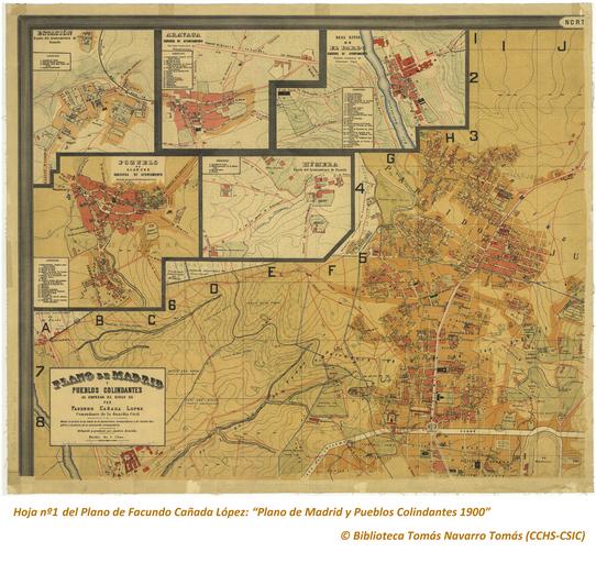 Keywords: Hoja1 Plano FacundoCL.jpg es Hoja 1 del Plano de Madrid en 1900 dibujado por Facundo Cañada Descripción física del plano total por el autor El plano consta de 6 hojas cada una de las cuales mide 59 cm de altura por 72 cm de ancho de trabajo por supuesto nada de anchos de cenefas y por lo tanto al unirlas forman un plano que mide 1 44 metros de ancho y 1 77 de alto y las márgenes en blanco se está tirando escrupulosamente en ocho colores y en superior papel hallándose perfectamente grabado Facundo Cañada López 1900 Descripción cartográfica del plato total Plano de Madrid y Pueblos colindantes de Aravaca Canillas Canillejas Carabanchel Alto Carabanchel Bajo Chamartín El Pardo Real Sitio Fuencarral Getafe Hortaleza Leganés Pozuelo de Alarcón con sus barrios de Húmera y Estación; Vallecas Vicálvaro Villaverde etc al principiar el siglo XX El plano va acompañado de una Guía con el Directorio de Madrid y otras notas aclaratorias Información estadística y nomenclator del plano por el autor La superficie del término municipal de Madrid de la época es de 821 189 581 pies cuadrados equivalentes a 18 621 fanegas del marco de Madrid o sean 6475 hectáreas y 54 áreas; resultando de dicha superficie una proporción de 120 52 metros cuadrados por habitante pues estos son 528 984 según el último empadronamiento general verificado en 1º de Diciembre de 1900 En el plano se fijan los nombres de las plazas calles callejones cuestas etc que en la actualidad tienen detallándose la numeración que a cada casa corresponde dentro de cada manzana pues se fijan los primeros y últimos números de cada una de éstas al principiar las calles y después los últimos en las manzanas sucesivas y de esta manera resulta toda la numeración de cada calle 1900 http //idehistoricamadrid org/hisdimad/documents/plano html CSIC-Biblioteca Tomás Navarro Tomás Facundo Cañada PD-Scan PD-old-auto-1923 1913 cc-zero PD-old-auto 1913 Plano de Madrid y pueblos colindantes al empezar el siglo XX |