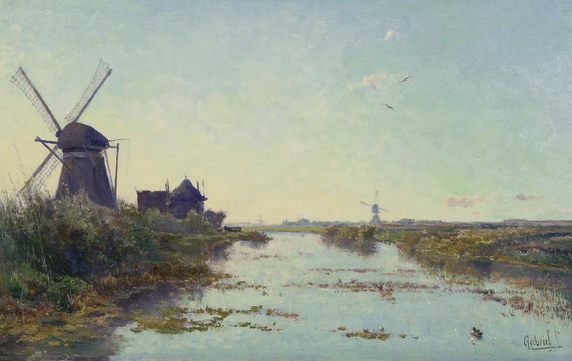 Keywords: Hollands polderlandschap met een wetering, een Zuid-Hollandse watermolen en een wipwatermolen, door Paul Joseph Constantin Gabriël.jpg nl Hollands polderlandschap met een wetering een Zuid-Hollandse watermolen en een wipwatermolen oil on canvas 30 x 46 5 cm signed b r Gabriel f < 1903 http //www marksmit nl/kunstwerk/paul-gabriel-hollands-polderlandschap-met-een-wetering-een-zuid-hollandse-watermolen-en-een-wipwatermolen/ Mark Smit Kunsthandel Creator Paul Joseph Constantin Gabriël other versions Custom license marker 2016 09 30 PD-old-100 Paul Joseph Constantin Gabriël |
