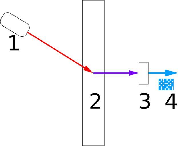 Keywords: Hologram lezen.svg Illustratie bij holografische opslag- uitlezen Fasen in het uitlezen 1 laserbeam 2 opslagmedium 3 CCD 4 Data-page own Van Haerenborgh Dirk Holography