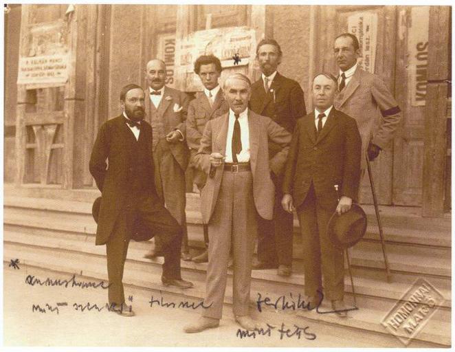 | Keywords: Homonnai Makó 1924-09-18.jpg LangSwitch Hungarian writers and poets in front of the Hollósy Komélia Theatre Makó First row Gyula Juhász Ferenc Móra and Ödön Réti Back row János Espersit Attila József Lajos Károlyi and Endre Vertán Photograph by Nándor Homonnai Juhász Gyula dr Espersit János József Attila Károlyi Lajos Vertán Endre Móra Ferenc és Réti Ödön a makói Hollósy Komélia Színház előtt Homonnai Nándor fényképfelvétele Institution Petőfi Literary Museum Budapest 2423 http //franka-egom ofm hu/ Temesvári Pelbárt Ferences Gimnázium http //franka-egom ofm hu/irattar/irasok_gondolatok/konyvismertetesek/konyvek_12/jozsef_attila/jozsef_attila_tanulmanyok/uj_anyagok/pim_anyaga/fotok_2 htm Info http //franka-egom ofm hu/irattar/irasok_gondolatok/konyvismertetesek/konyvek_12/jozsef_attila/jozsef_attila_tanulmanyok/uj_anyagok/pim_anyaga/pim_foto_10 jpg Pic 1924-09-18 Creator Nándor Homonnai PD-old Photographs by Nándor Homonnai Photographs in the Petőfi Literary Museum Budapest 1924 photographs 1924 works in Hungary Gyula Juhász János Espersit Attila József Ferenc Móra Lajos Károlyi Ödön Réti Group photographs of men ImageNote 1 203 143 60 79 800 619 2 Gyula Juhász ImageNoteEnd 1 ImageNote 2 248 98 54 72 800 619 2 János Espersit ImageNoteEnd 2 ImageNote 3 385 124 65 86 800 619 2 Ferenc Móra ImageNoteEnd 3 ImageNote 4 337 93 61 77 800 619 2 Attila József ImageNoteEnd 4 ImageNote 5 445 63 57 79 800 619 2 Lajos Károlyi ImageNoteEnd 5 ImageNote 6 540 123 63 88 800 619 2 Ödön Réti ImageNoteEnd 6 ImageNote 7 580 55 63 82 800 619 2 Endre Vertán ImageNoteEnd 7 |