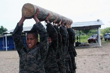 Keywords: Honduran Fuerza Especiales Naval with a trunk.jpg Honduran Fuerza Especiales Naval FEN candidates use teamwork to perform physical training exercises with a heavy log at a local beach in Honduras in the fall of 2012 Log physical training exercises were one of many physically demanding exercises as part of two eight-week Basic Underwater Demolition/SEAL-style selection courses conducted by members of the U S Naval Special Warfare Task Element-Alpha in order to assist their Honduran counterparts establish this elite unit within the Honduran military The FEN is a maritime unit of special operators capable of combating transnational organized crime in and around their waterways U S Navy Photo by ITC Gino Rullo Naval Special Warfare Unit-FOUR http //www arsouth army mil/news/southcomnews/4626-us-navy-special-forces-help-honduras-form-elite-counter-trafficking-force html Gino Rullo PD-USGov-Military-Navy Special forces of Honduras |