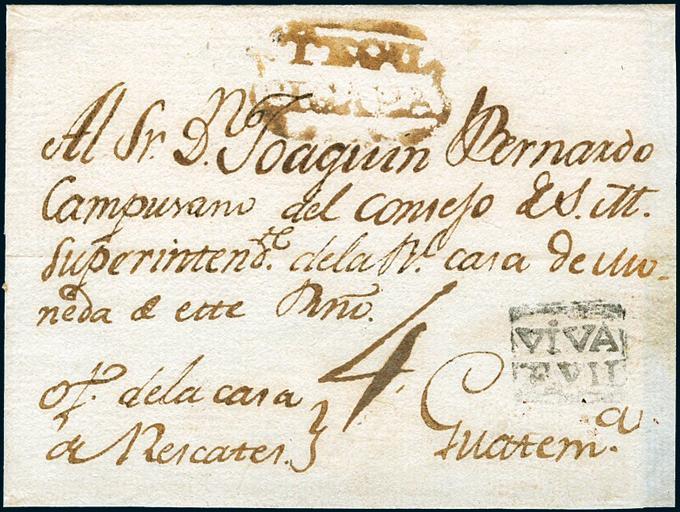 | Keywords: Honduras 1810 folded letter.jpg en Honduras circa 1810 Tegucigalpa oval cancel on partial folded letter cover Viva/F VII for Ferdinand VII manuscript 4 rate addressed Superintendent of the mint in Guatemala Approx 1810 Scan of original Government of Honduras PD-old-100 Postal history of Honduras |