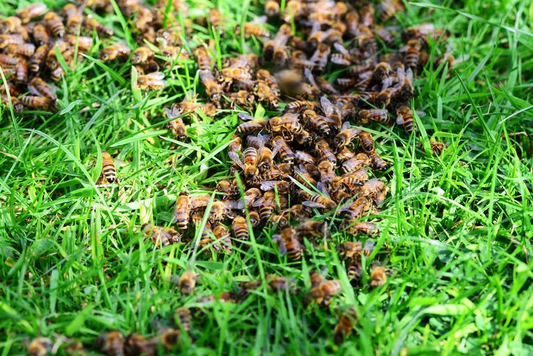 Keywords: honey bees bees grass lawn close-up many hive insects